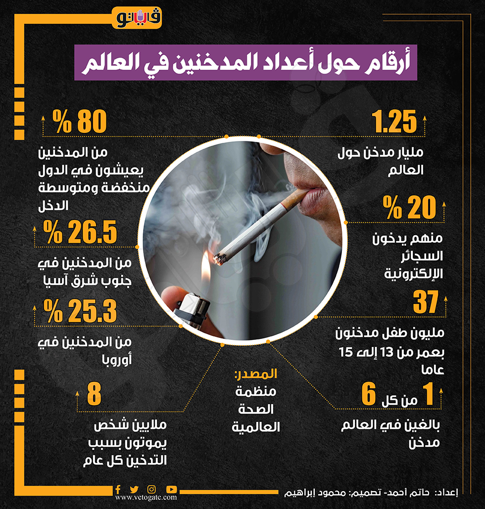 أرقام حول أعداد المدخنين في العالم (إنفوجراف) الخميس 06/يونيو/2024 - 02:30 م 6/6/2024 2:30:51 PM التدخين، فيتو حاتم أحمد شارك طباعة 18 حجم الخط شارك طباعة التدخين عدد المدخنين حول العالم السجائر الإلكترونية منظمة الصحة العالمية