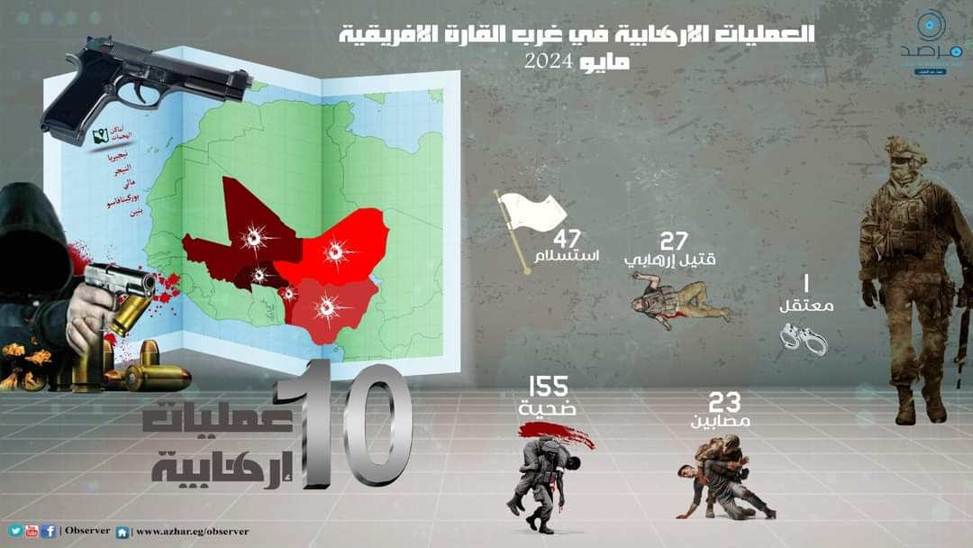 أما من حيث جهود مكافحة التنظيمات الإرهابية في منطقة غرب إفريقيا، فقد بلغ عدد القتلى من العناصر الإرهابية خلال شهر مايو 2024 (27) قتيلًا، واعتقال آخر، فضلًا عن استسلام (47) طواعية لقوات الجيش.