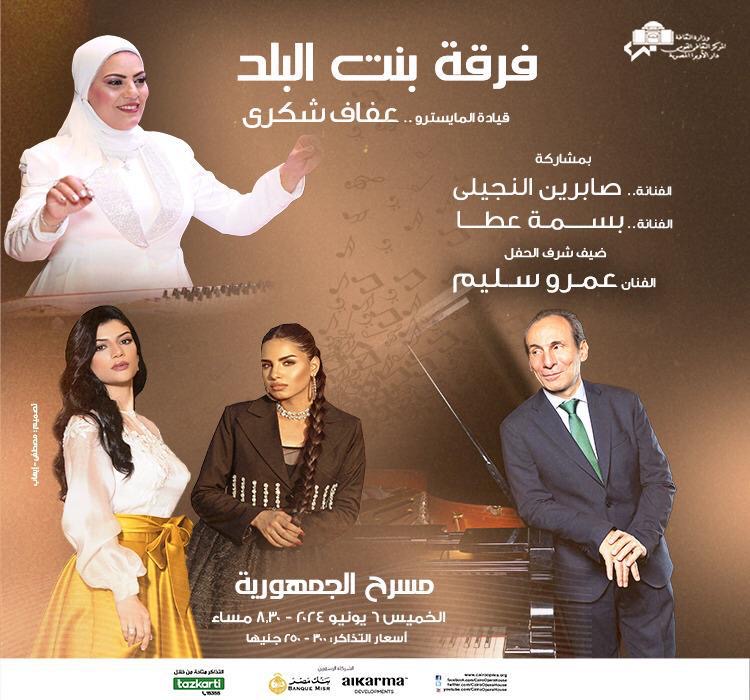 تنظم دار الأوبرا المصرية برئاسة الدكتورة لمياء زايد حفلا لفرقة بنت البلد بقيادة المايسترو عفاف شكري ومشاركة الفنانتين صابرين النجيلى وبسمة عطا مع ضيف الشرف عازف البيانو الشهير والموزع الموسيقى عمرو سليم، وذلك في الثامنة والنصف مساء الخميس 6 يونيو على مسرح الجمهورية.