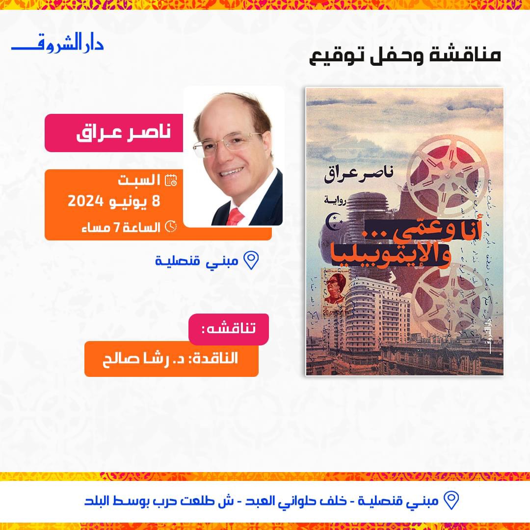 تنظم دار الشروق للنشر والتوزيع، حفل توقيع ومناقشة رواية "أنا وعمي والإيموبيليا" للروائي ناصر عراق، وذلك يوم السبت المقبل الموافق 8 يونيو الجاري، في تمام الساعة 7 مساء، بمبنى قنصلية بوسط البلد.