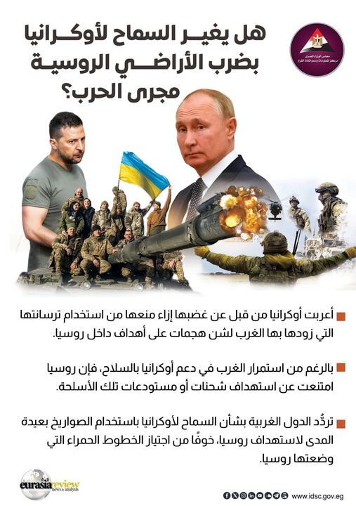 كشف مركز المعلومات ودعم اتخاذ القرار بمجلس الوزراء عن مصير الحرب بين أوكرانيا وروسيا بعد السماح لأوكرانيا بضرب الأراضي الروسية.
