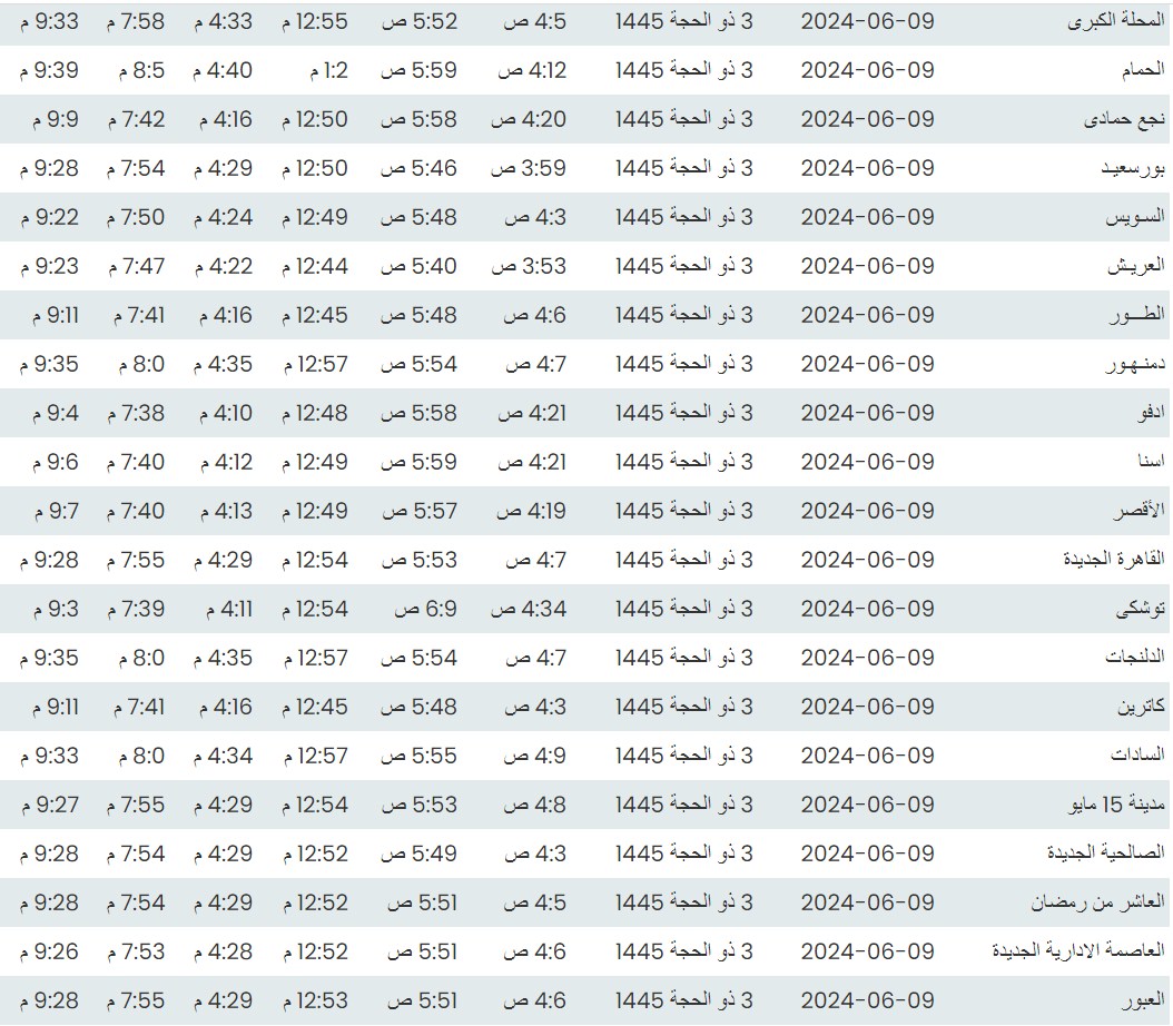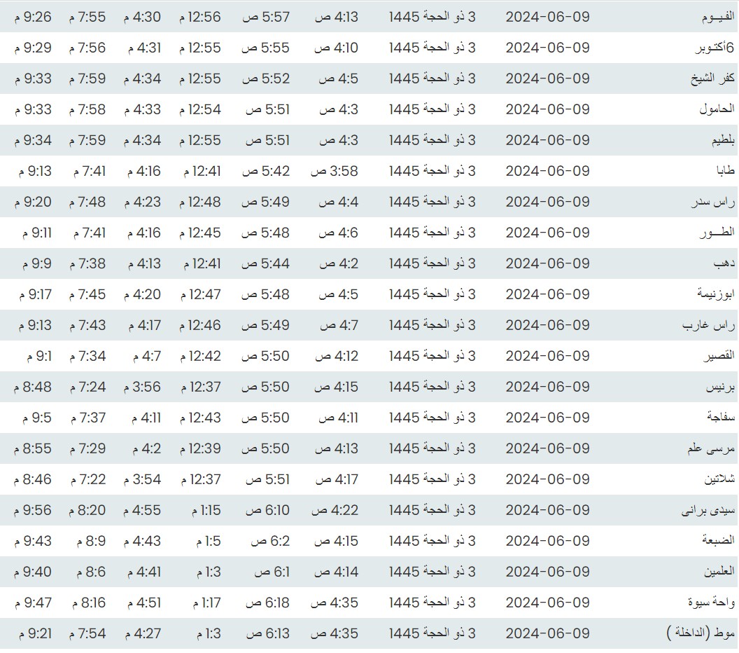 مواقيت الصلاة اليوم وفقًا للتوقيت المحلي لمدينتي القاهرة والإسكندرية وكذلك،مواقيت الصلاة، لعدد من مدن ومحافظات الجمهورية من واقع بيانات الهيئة العامة للمساحة