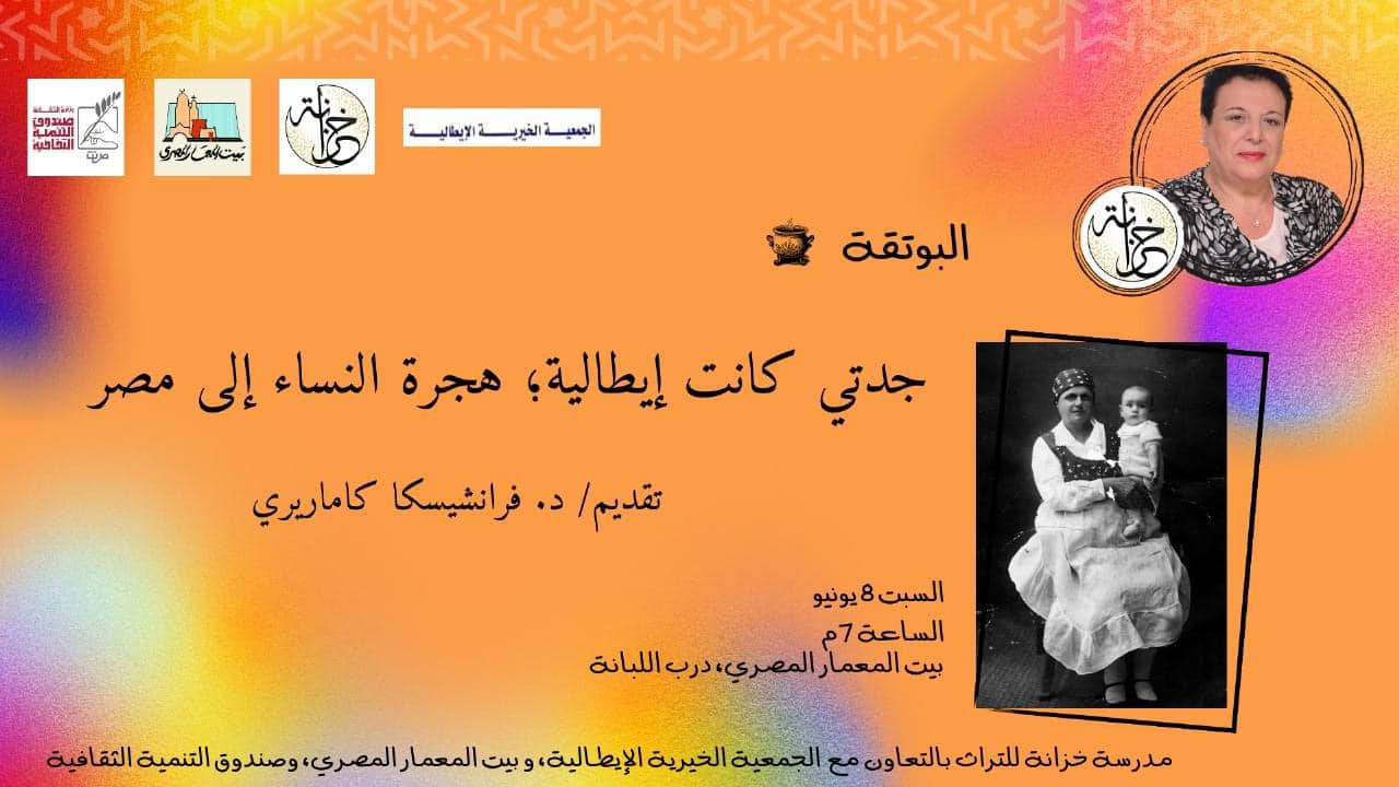 أعلن بيت المعمار المصري ومدرسة خزانة للتراث عن إقامة وفعالية جديدة من فعاليات البوتقة بعنوان "جدتي كانت إيطالية: هجرة النساء إلى مصر" يوم السبت 8 يونيو في تمام الساعة 7 مساء.