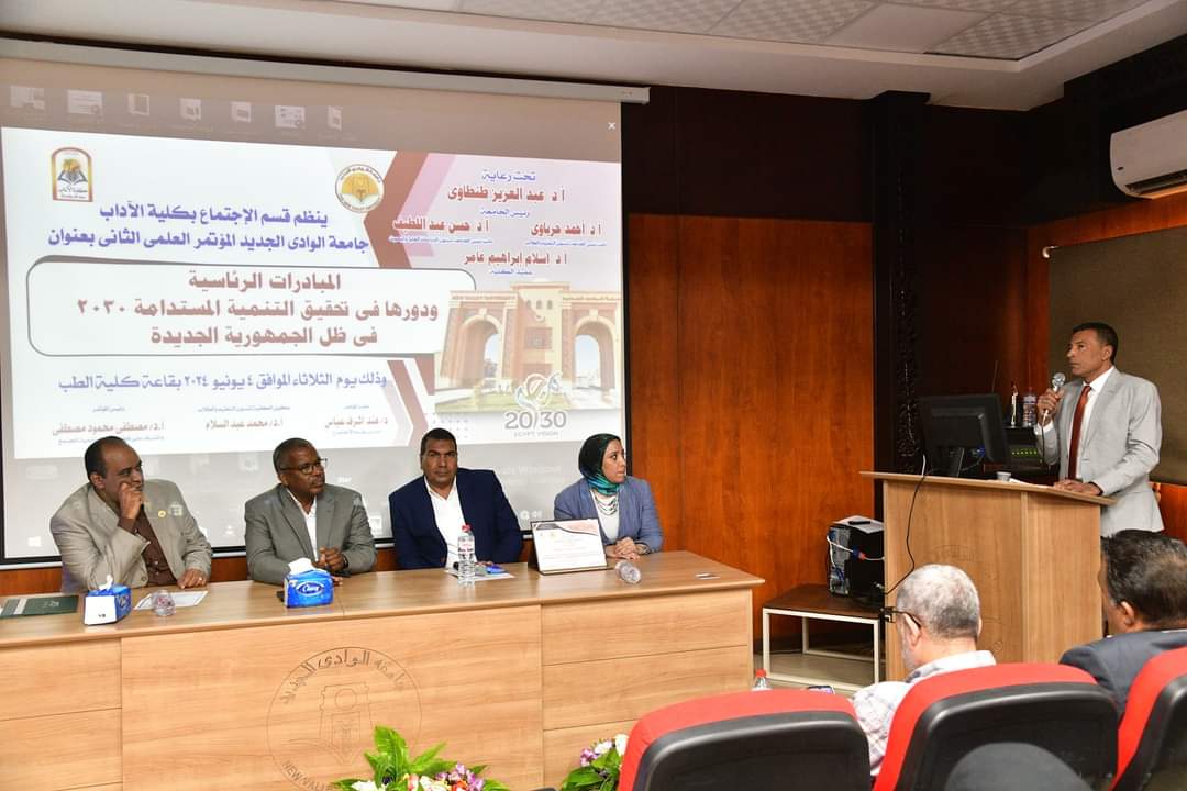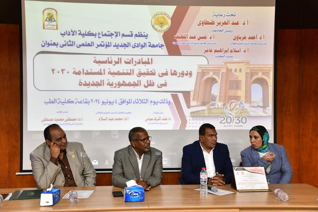 نظم قسم الاجتماع بكلية الآداب بجامعة الوادي الجديد، اليوم الأربعاء، المؤتمر العلمى الثانى بعنوان “المبادرات الرئاسية ودورها فى التنمية المستدامة 2030 فى ظل الجمهورية الجديدة تحت رعاية الأستاذ الدكتور عبد العزيز طنطاوى رئيس الجامعة والأستاذ الدكتور حسن عبداللطيف نائب رئيس الجامعة لشئون الدراسات العليا والبحوث، والأستاذ الدكتور أحمد سيد حرباوي نائب رئيس الجامعة لشئون التعليم والطلاب وإشراف الأستاذ الدكتور إسلام عامر عميد كلية الآداب والأستاذ الدكتور مصطفى محمود المشرف على قطاع خدمة المجتمع وتنمية البيئة بالجامعة ورئيس قسم الاجتماع ورئيس المؤتمر، والأستاذ الدكتور محمد عبد السلام وكيل كلية الآداب لشئون التعليم والطلاب والدكتورة هند اشرف مقرر المؤتمر وبحضور أعضاء هيئة التدريس ومعاونيهم بكلية الآداب والدكتور هانى عيد المشرف على إدارة العلاقات العامة بالجامعة ومحمد حسين المستشار الإعلامى للجامعة وعدد من القيادات التنفيذية والشعبية ومشاركة قيادات من الأزهر والكنيسة والمجلس القومى للمرأة والمجلس القومى للسكان ومراكز الإعلام بالوادى الجديد.