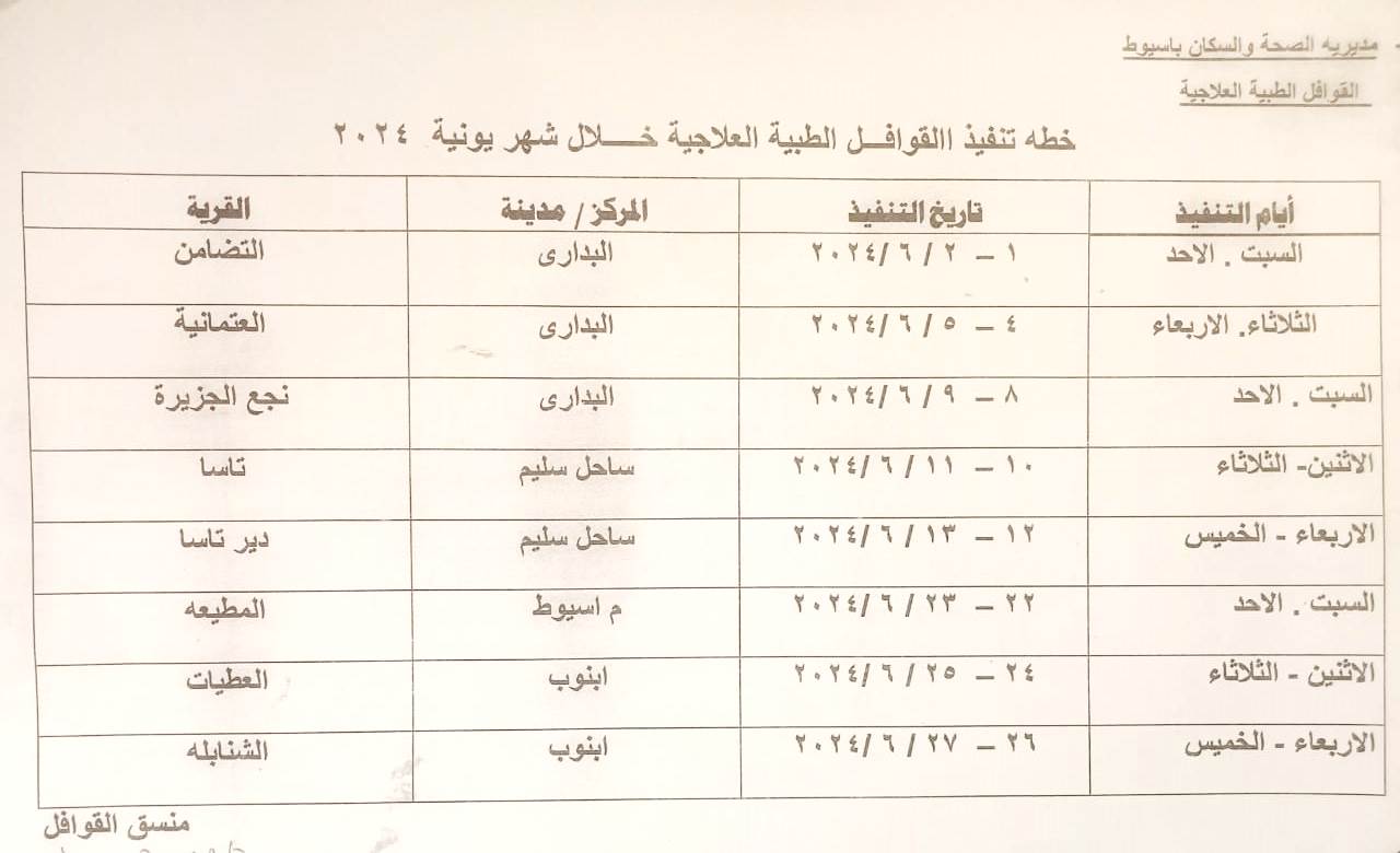 ثم قرية دير تاسا يومي الأربعاء والخميس 12 و13 يونيو ثم تنتقل القافلة لمركز أسيوط وتقدم الخدمات العلاجية لأهالي قرية المطيعة يومي السبت والأحد 22 و23 يونيو وتختتم القافلة أعمالها بمركز أبنوب يومي الإثنين والثلاثاء 24 و25 يونيو بقرية العطيات ثم يومي الأربعاء والخميس 26 و27 يونيو بقرية الشانبلة التابعة لمركز أبنوب.