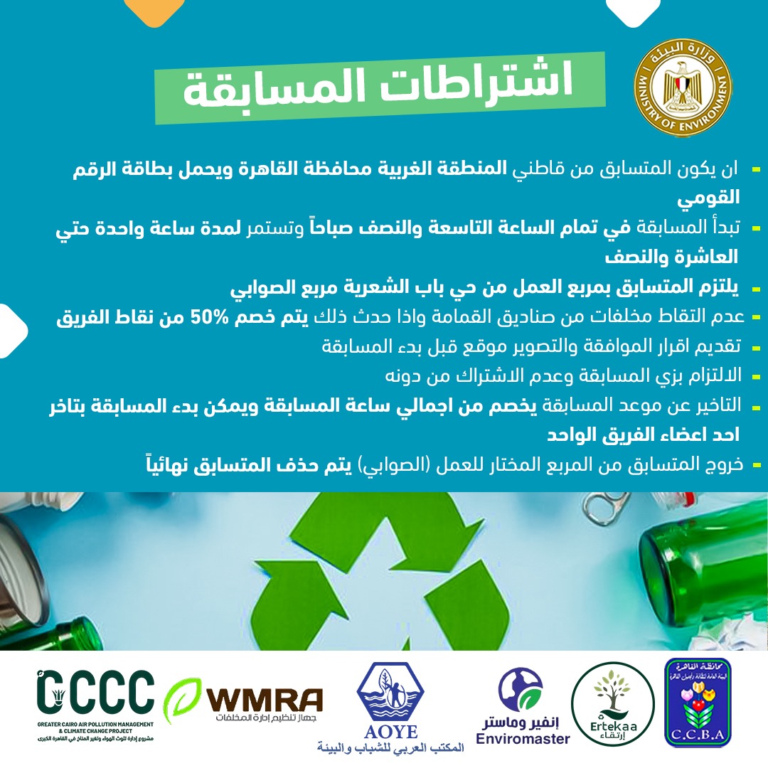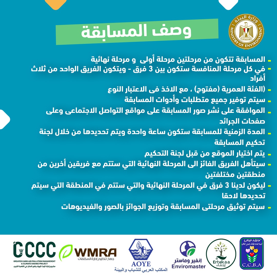 وأوضحت الدكتورة ياسمين فؤاد أن المسابقة يتم تنفيذها، بدعم من مشروع البنك الدولي "الحد من تلوث الهواء وتغير المناخ في القاهرة الكبرى" وبمشاركة كل من هيئة نظافة وتجميل القاهرة، وشركتى إرتقاء وانفيروماستر للخدمات البيئية، وتأتي في إطار جهود وزارة البيئة لتعزيز الوعي بأهمية الحفاظ على البيئة من خلال غرس ثقافة النظافة لدى مختلف فئات المجتمع، مع التركيز على مشاركة الشباب كمحركٍ رئيسي للتغيير.