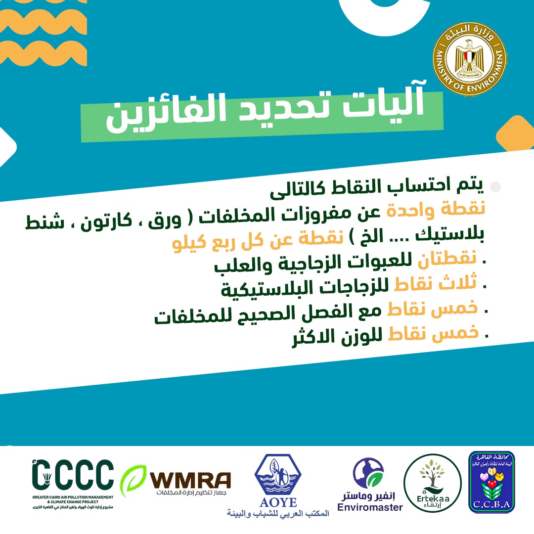 وأضافت وزيرة البيئة أنه سيتأهل الى المرحلة النهائية 3 فرق (فريق واحد من كل منطقة)، وتتضمن آليات المسابقة تحديد الفائزين من خلال احتساب عدد من النقاط نقطة واحدة عن القمامة العادية ( ورق، كارتون، شنط بلاستيك.... الخ)، نقطة عن كل ربع كيلو، ونقطتان للعبوات الزجاجية والعلب، وثلاث نقاط للزجاجات البلاستيكية، وخمس نقاط مع الفصل الصحيح للمخلفات، وخمس نقط للوزن الأكثر، كما تشمل جوائز المسابقة تقديم جوائز عينية في المرحلة الأولى، وتقديم جوائز مالية في المرحلة النهائية، وتشمل الجائزة الأولى 9 آلاف جنيه، والجائزة الثانية 6 آلاف جنيه، والجائزة الثالثة 3 آلاف جنيه، كما سيتم توزيع ميداليات (فضية، وبرونزية، وذهبية) للمشاركين فى النهائيات، على أن يتم تسليم الجوائز النهائية وتسليم كأس البطولة النهائية إلى الفريق الفائز الأول ضمن احتفالات يوم البيئة العالمي ٢٠٢٤.