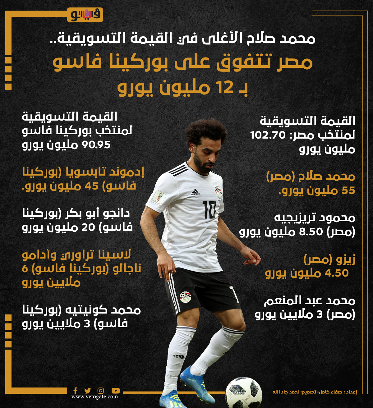 محمد صلاح الأغلى في القيمة التسويقية.. مصر تتفوق على بوركينا فاسو بـ 12 مليون يورو (إنفوجراف) الخميس 06/يونيو/2024 - 08:28 م 6/6/2024 8:28:11 PM محمد صلاح، فيتو صفاء كامل شارك طباعة 18 حجم الخط شارك طباعة منتخب مصر بوركينا فاسو كاس العالم 2026 التصفيات الإفريقية القيمة التسويقية مباراة منتخب مصر وبوركينا فاسو منتخب مصر وبوركينا فاسو محمد صلاح