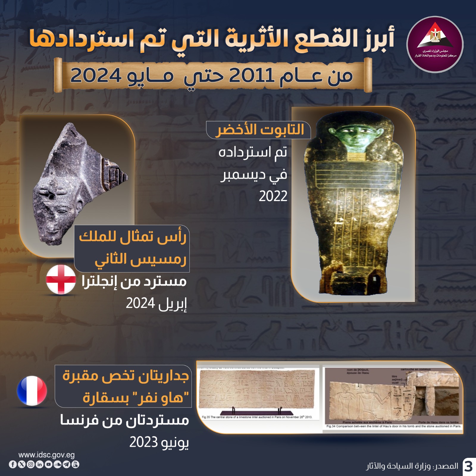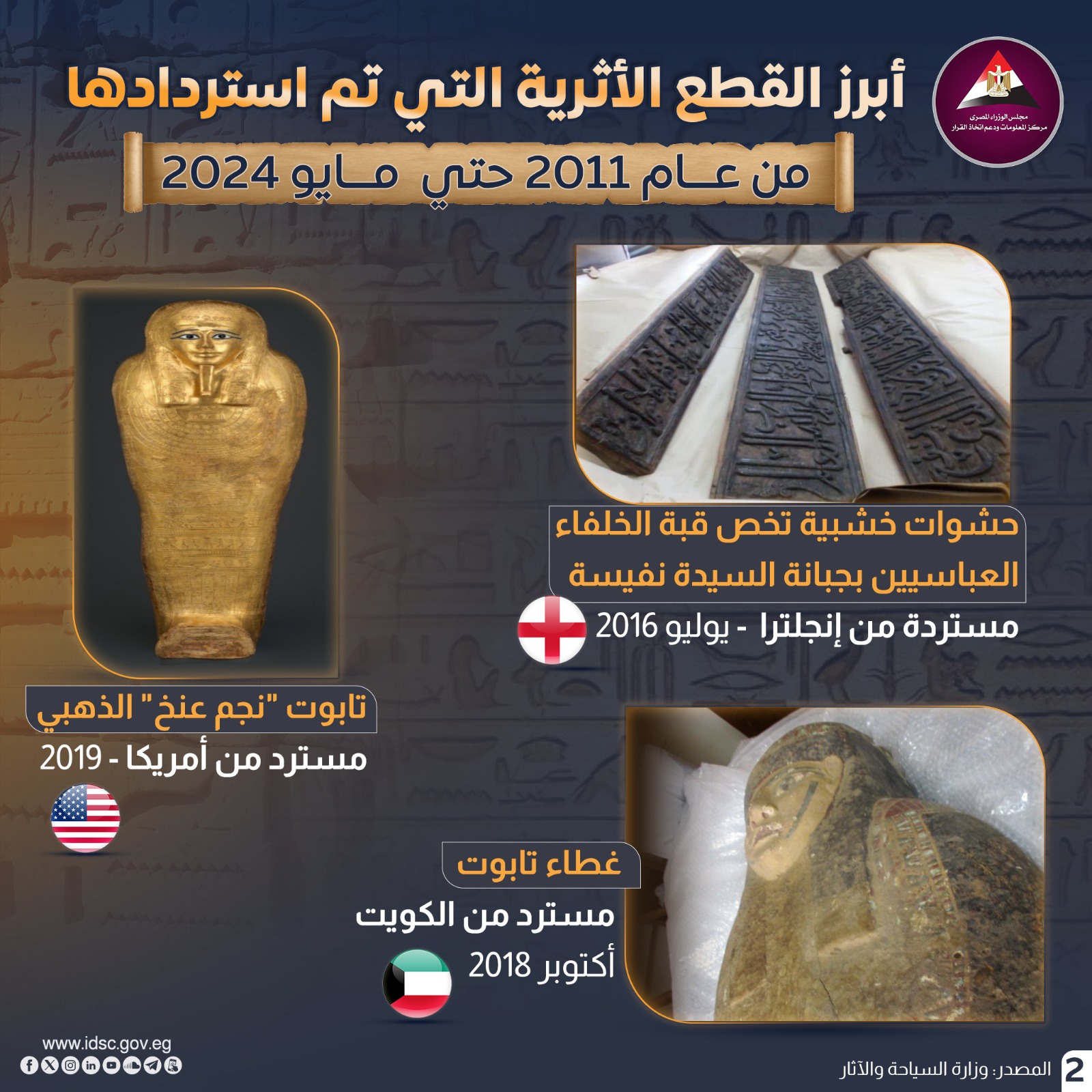كشف مركز المعلومات ودعم اتخاذ القرار بمجلس الوزراء عن أبرز القطع الأثرية التي تم استردادها من 2011 حتى مايو 2024.