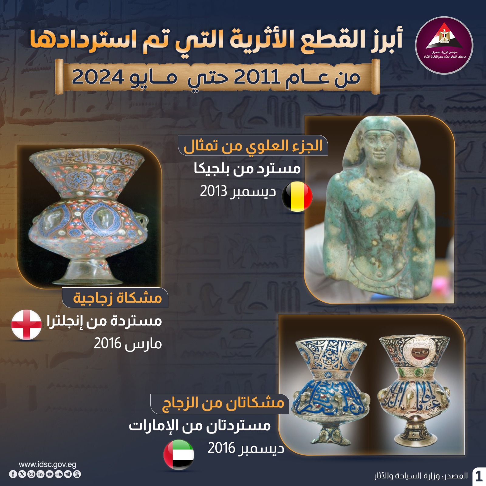 أبرز القطع الأثرية المستردة من 2011 وحتى 2024 (إنفوجراف)