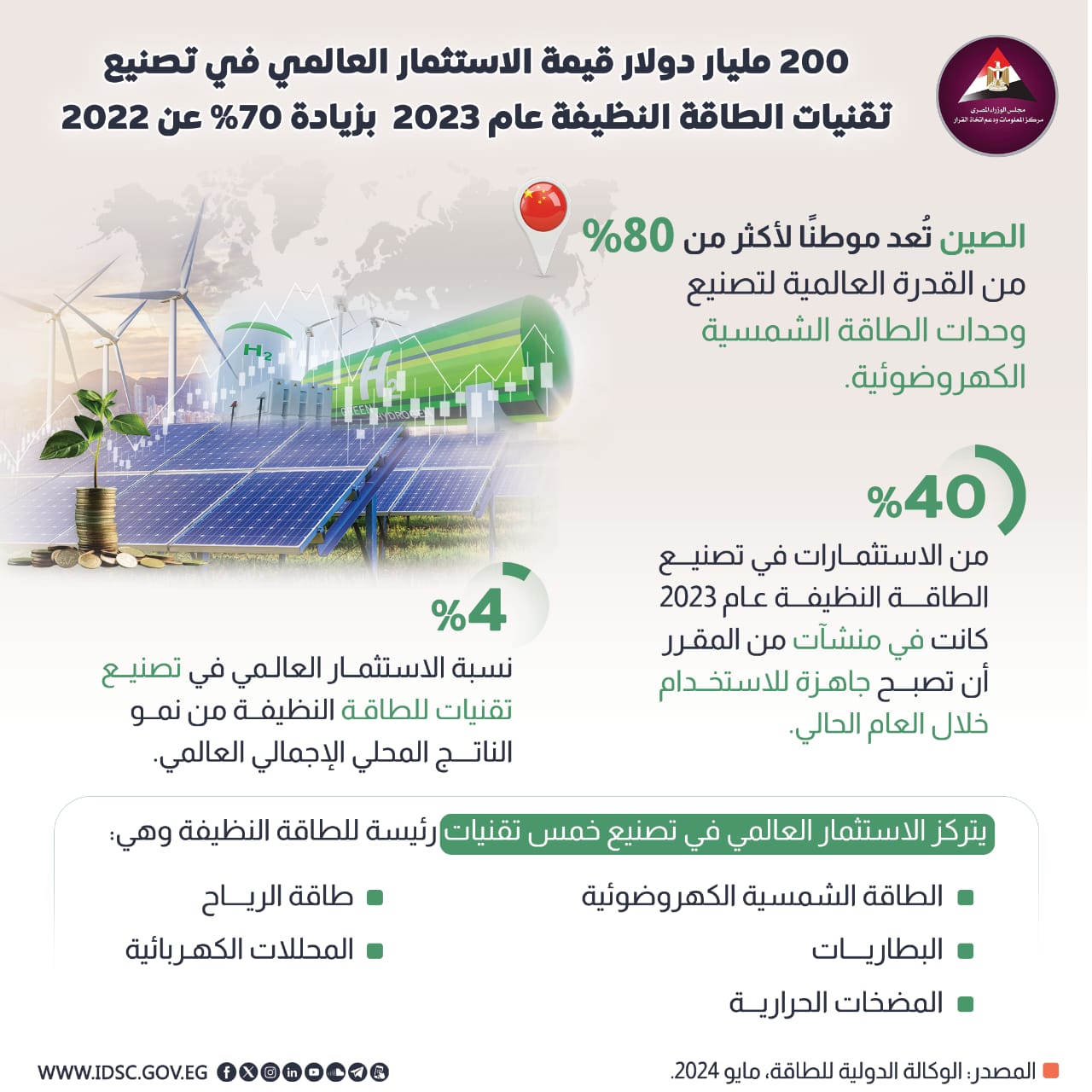 كشف مركز معلومات مجلس الوزراء عن قيمة الاستثمارات العالمية في تصنيع تقنيات الطاقة النظيفة خلال عام 2023.