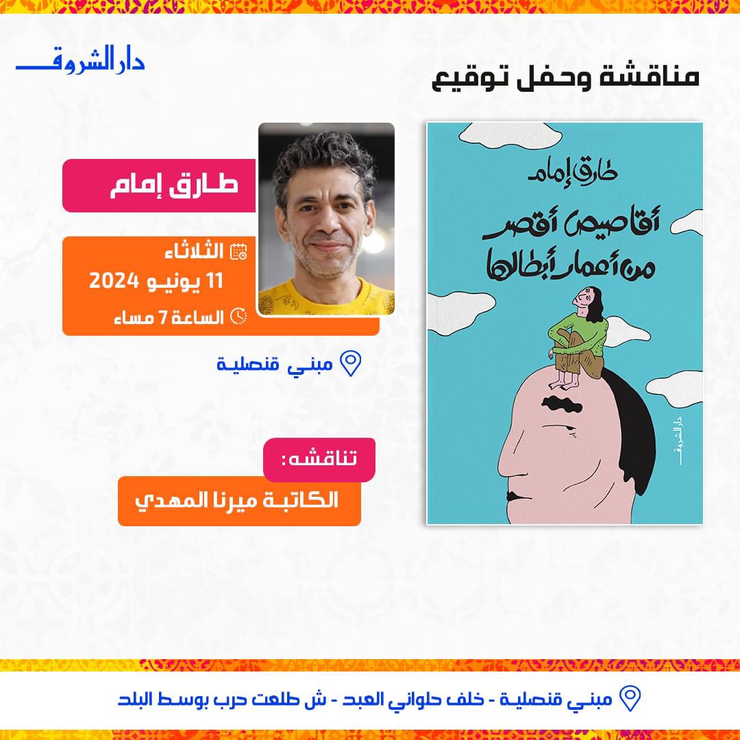تنظم دار الشروق للنشر والتوزيع، حفل توقيع ومناقشة المجموعة القصصية "أقاصيص أقصر من أعمار أبطالها" للكاتب طارق إمام، وذلك يوم الثلاثاء المقبل الموافق 11 يونيو الجاري في تمام الساعة 7 مساء في مبنى قنصلية بوسط البلد، وتناقشه الكاتبة ميرنا المهدي.