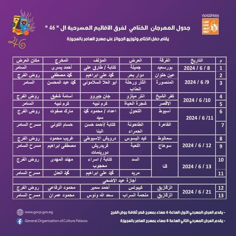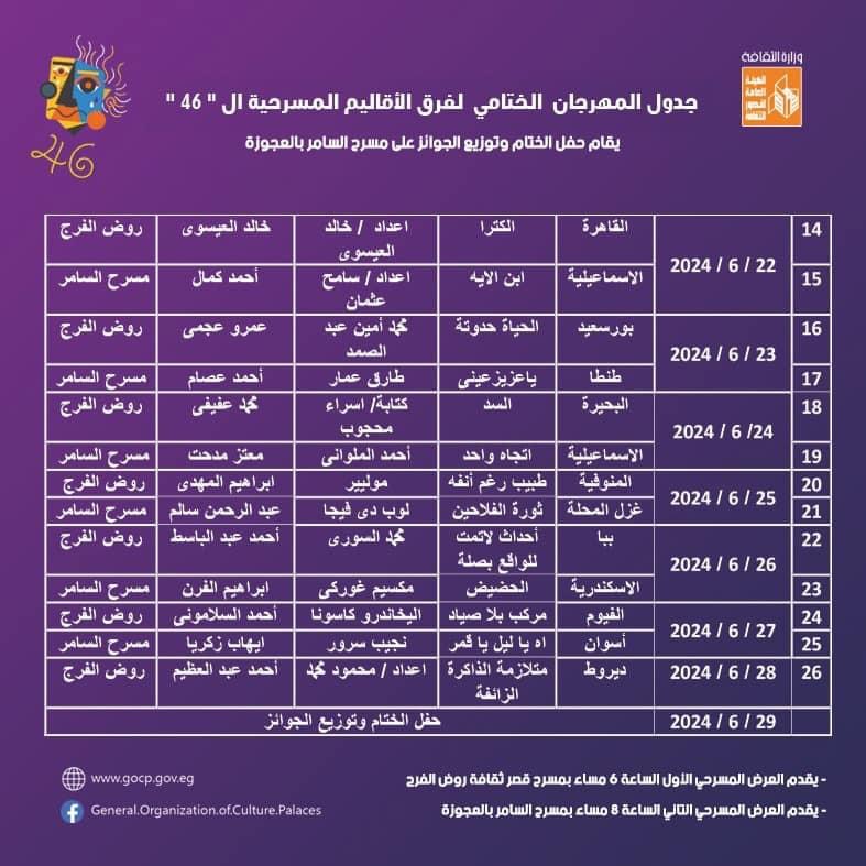 تفاصيل المهرجان الختامي للفرق المسرحية.. 26 عرضا تتنافس على جوائز الدورة 46.. تقدم مجانا للجمهور في السامر وقصر روض الفرج.. وهؤلاء أعضاء لجنة التحكيم