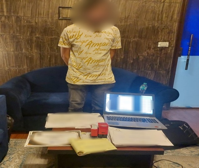 وعقب تقنين الإجراءات تم استهدافه وأمكن ضبطه وعثر بحوزته على (العديد من الشهادات المنسوبة صدورها لإحدى الشركات العالمية "مزورة" – 2 ختم خاص بالكيان - جهاز حاسب آلى "بفحصه فنيًا تبين احتواؤه على دلائل تؤكد نشاطه الإجرامي").