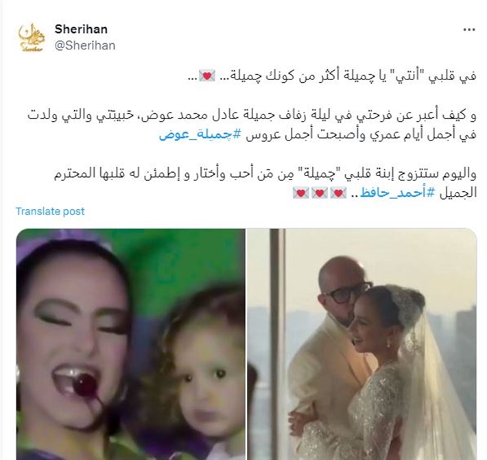 ونشرت شريهان صورة لها وهي تحمل جميلة في طفولتها وصورة لجميلة بفستان الزفاف مع عريسها، وكتبت عبر حسابها بموقع X: "في قلبي "أنتي" يا جميلة أكثر من كونك جميلة، وكيف أعبر عن فرحتي في ليلة زفاف جميلة عادل محمد عوض، حَبيبَتي والتي ولدت في أجمل أيام عمري وأصبحت أجمل عروس جميلة عوض، واليوم ستتزوج ابنة قلبي "جميلة" مِن مَن أحب وأختار وإطمئن له قلبها المحترم الجميل أحمد حافظ".