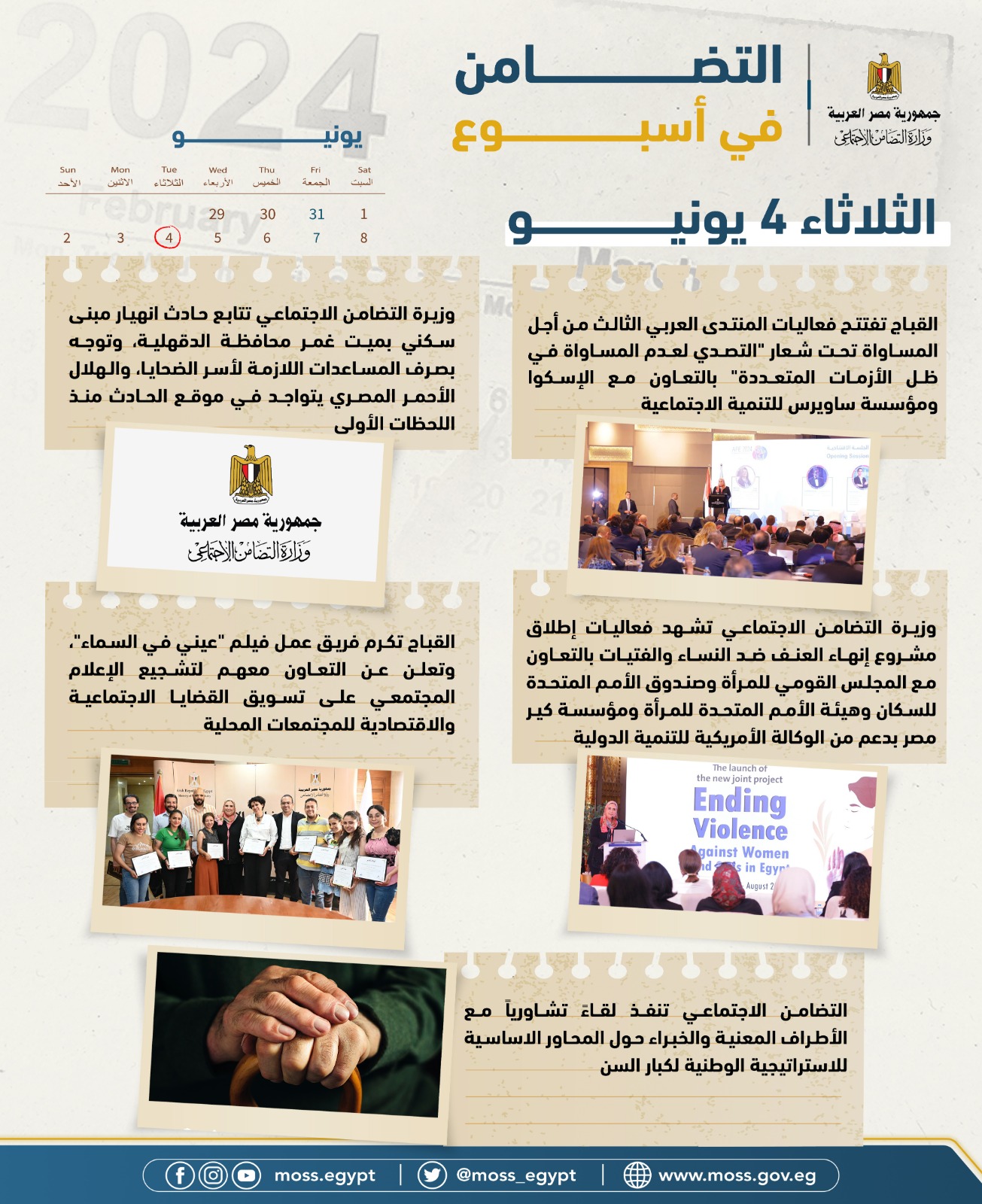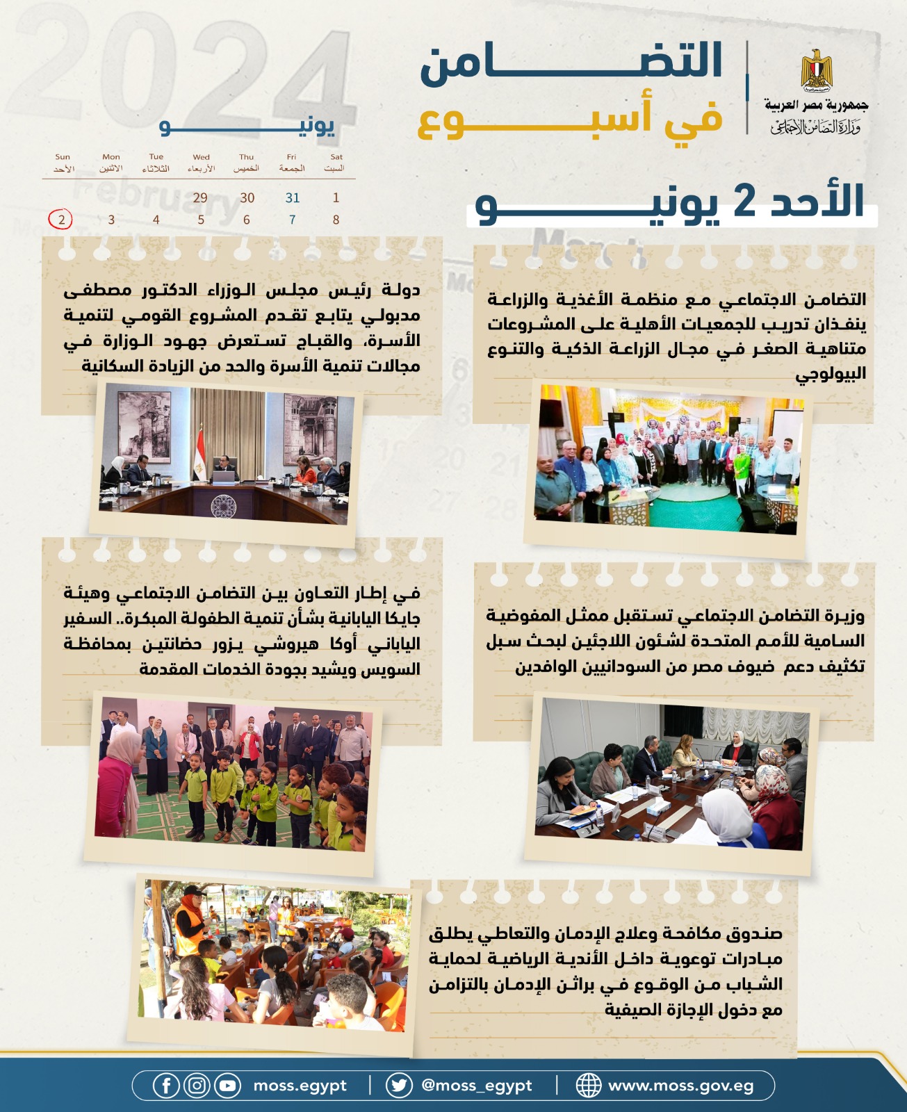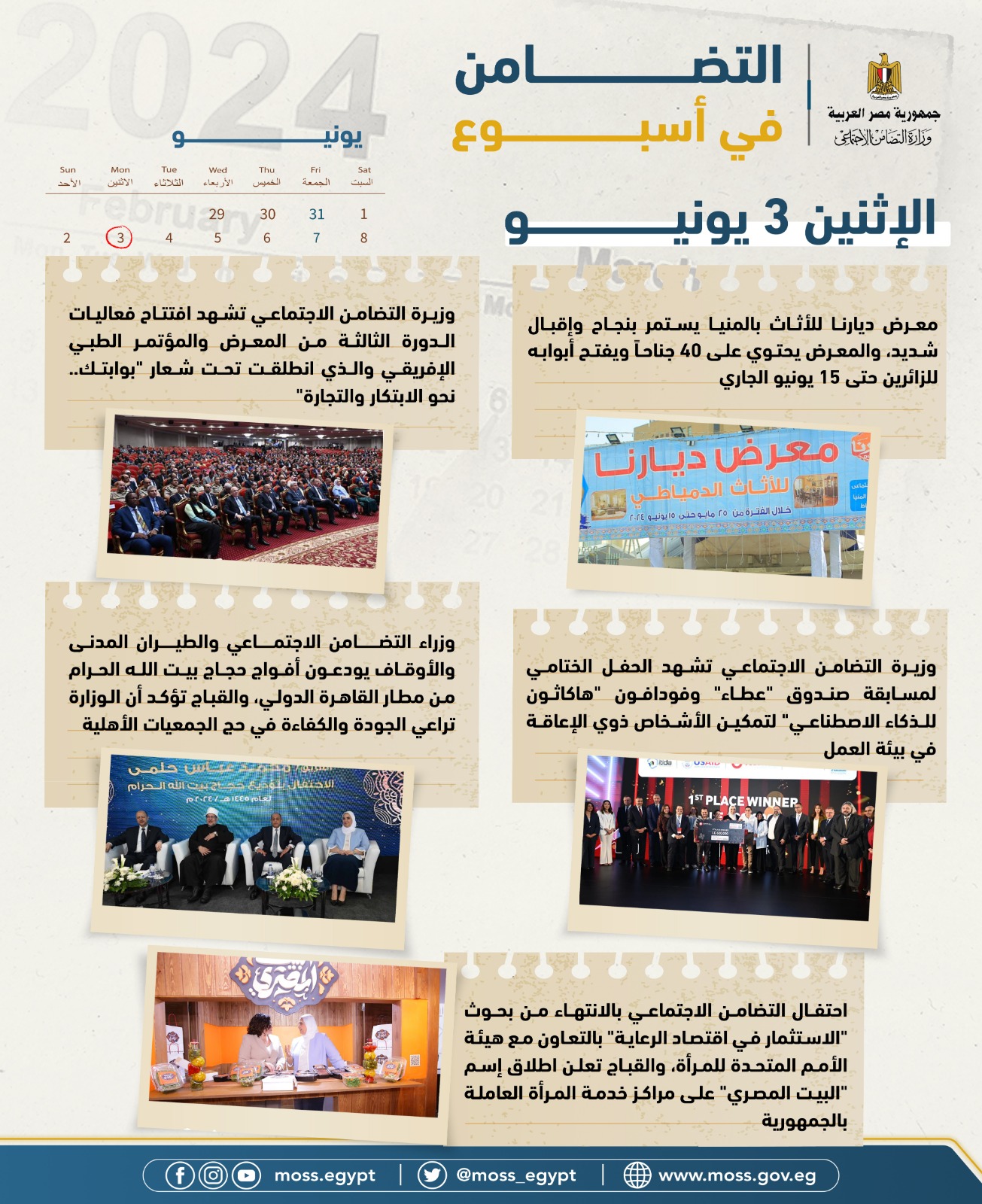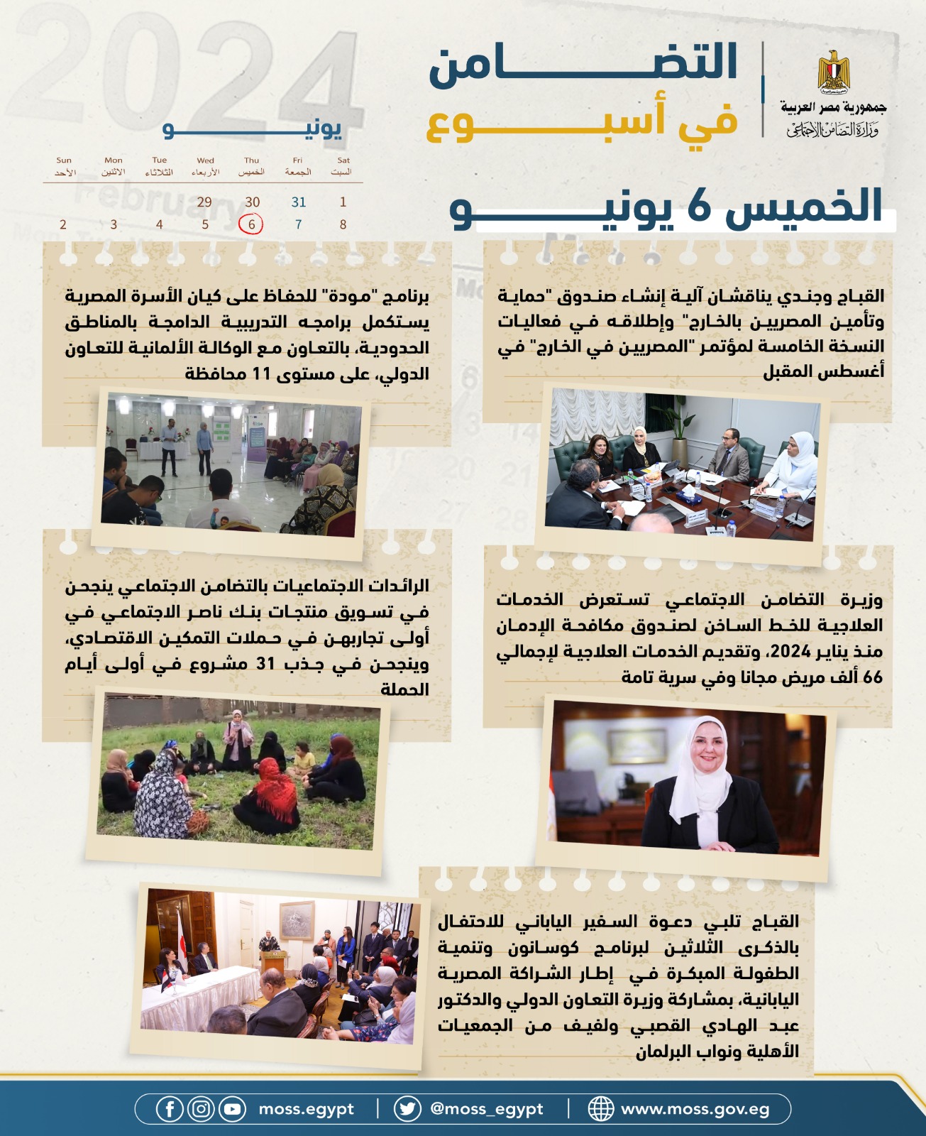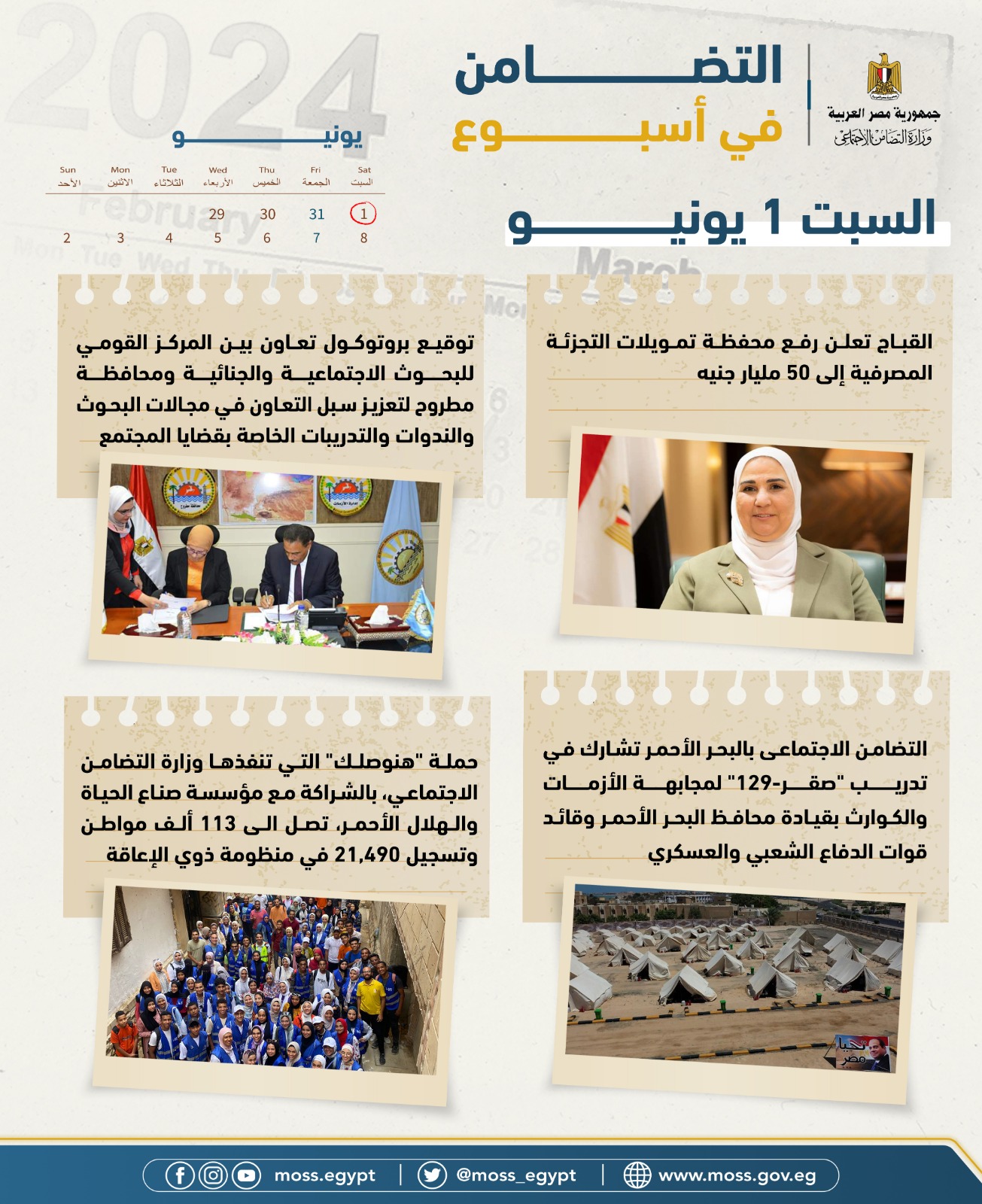أصدرت وزارة التضامن الاجتماعي تقريرها الأسبوعي بالإنفوجراف، حيث تستعرض من خلاله الأنشطة والأحداث، التي قامت بها السيدة نيفين القباج وزيرة التضامن الاجتماعي، وكذلك قطاعات الوزارة المختلفة خلال الفترة من 1 يونيو إلى 6 يونيو 2024، ونستعرض أبرزها في التقرير التالي: