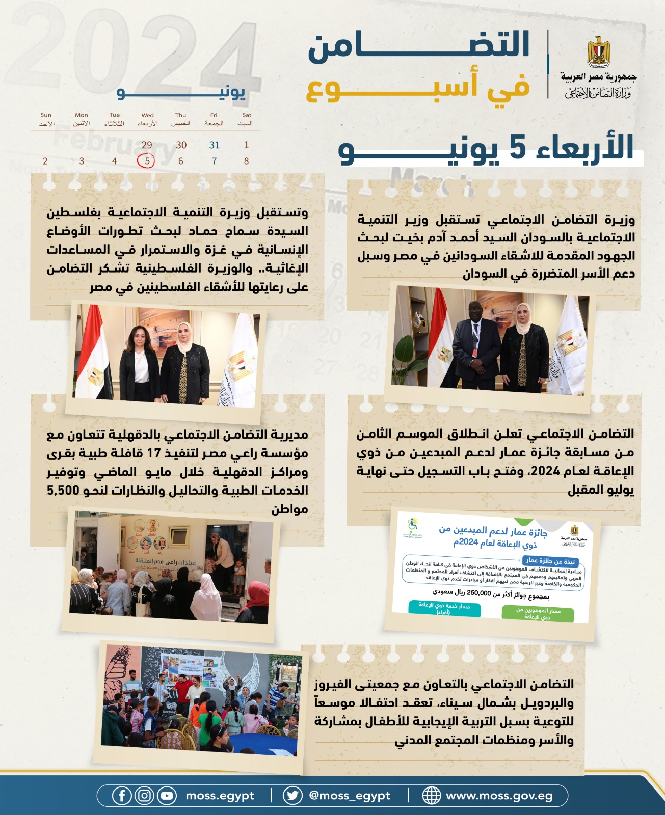 - التضامن الاجتماعي تعلن انطلاق الموسم الثامن من مسابقة جائزة عمار لدعم المبدعين من ذوي الإعاقة لعام 2024، وفتح باب التسجيل حتى نهاية يوليو المقبل
