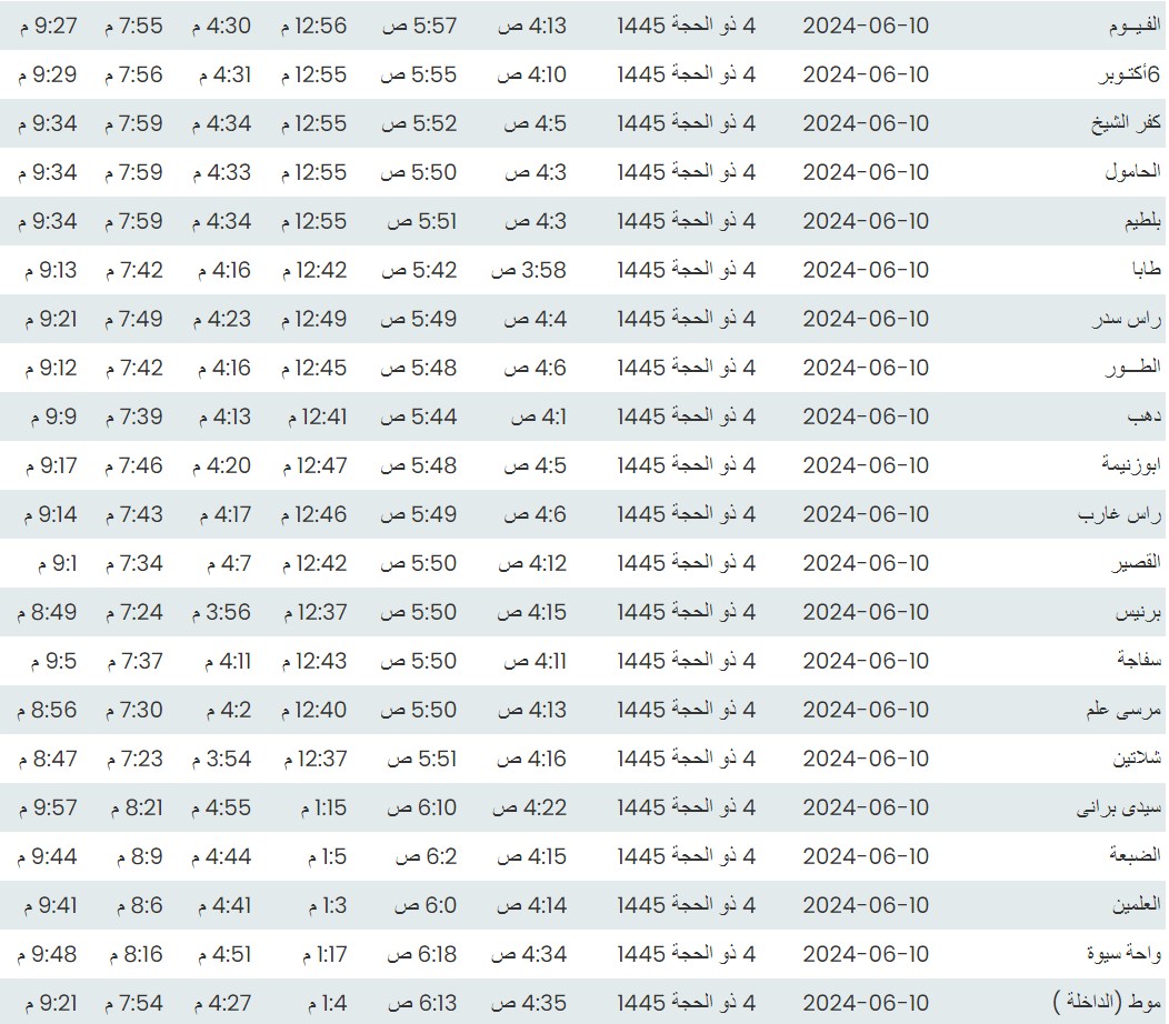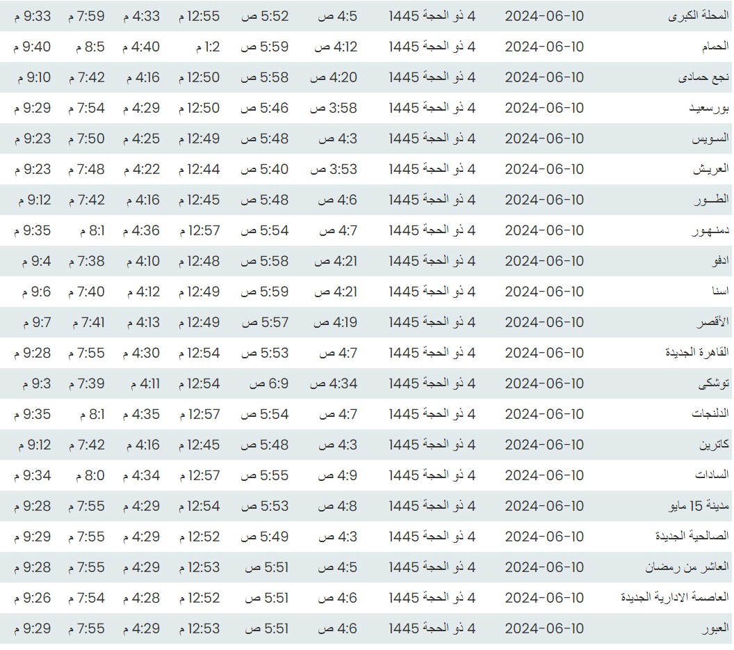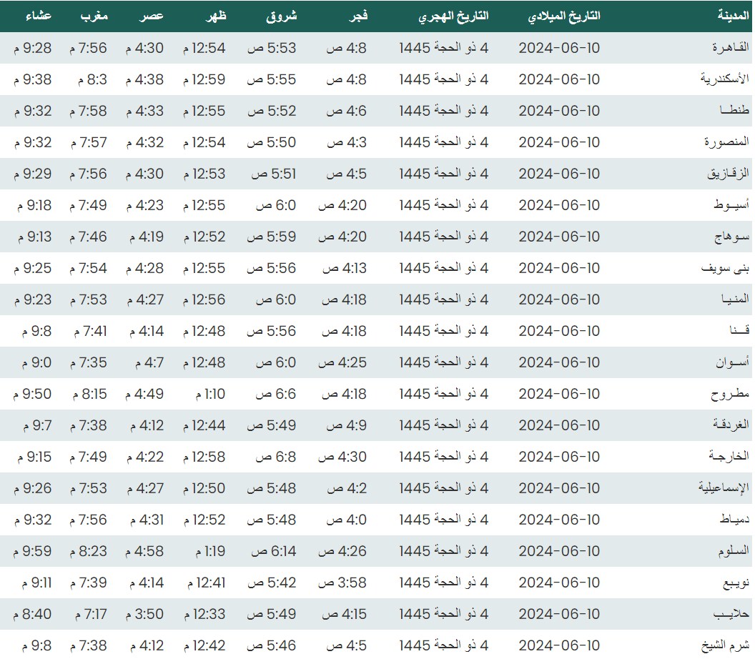 وفيما يلي مواقيت الصلاة، لعدد من مدن ومحافظات الجمهورية من واقع بيانات الهيئة العامة للمساحة