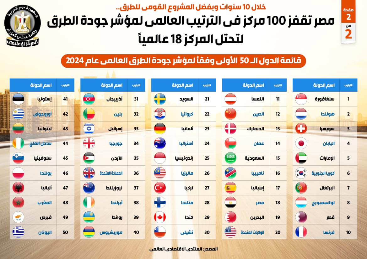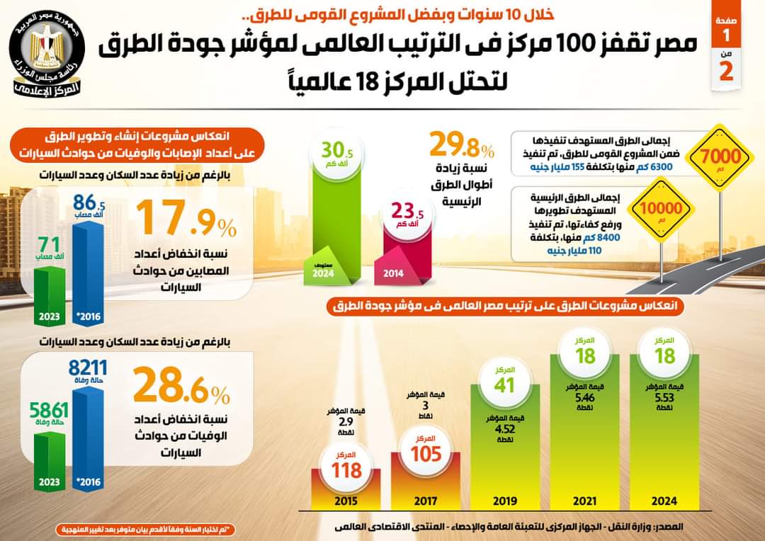 مصر تقفز 100 مركز بالترتيب العالمي لمؤشر جودة الطرق (انفوجراف)