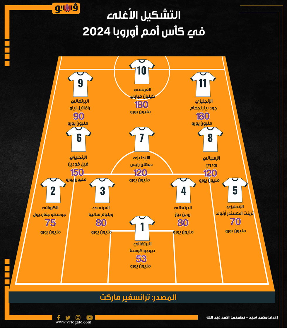 التشكيل الأغلى في كأس أمم أوروبا 2024 (إنفوجراف) الأحد 09/يونيو/2024 - 03:30 م 6/9/2024 3:30:15 PM مبابي، فيتو محمد سيد شارك طباعة 18 حجم الخط شارك طباعة مبابي كاس امم اوروبا يورو 2024 بيلينجهام الكسندر ارنولد
