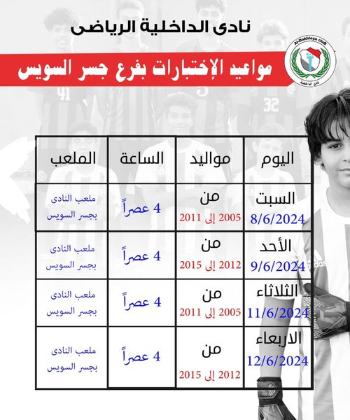 مواعيد اختبارات الناشئين 2024 بنادي الداخلية