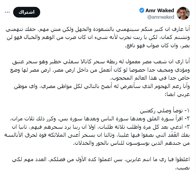 وكان عمرو واكد قد نشر تغريدة، على حسابه بمنصة "أكس"، تويتر سابقًا، زاعمًا أن المصريين مربوطين بسحر أسود، فقال "أنا عارف إن كثير منكم سيتهمني بالشعوذة والجهل ولكن مش مهم. حقك تتهمني وتشتم كمان، لكن يا ريت تجرب لأنه شيء إن كان ضرب من الوهم والخيال فهو لن يضر، وإن كان صواب فهو نافع. أنا أرى أن شعب مصر معمول له ربطة سحر كابالا سفلي خطير وهو سحر عتيق ومؤذي ومخيف جدا خصوصا لو كان اتعمل من داخل أرض مصر. أرض مصر لها وضع خاص جدا في هذا العالم المحجوب."