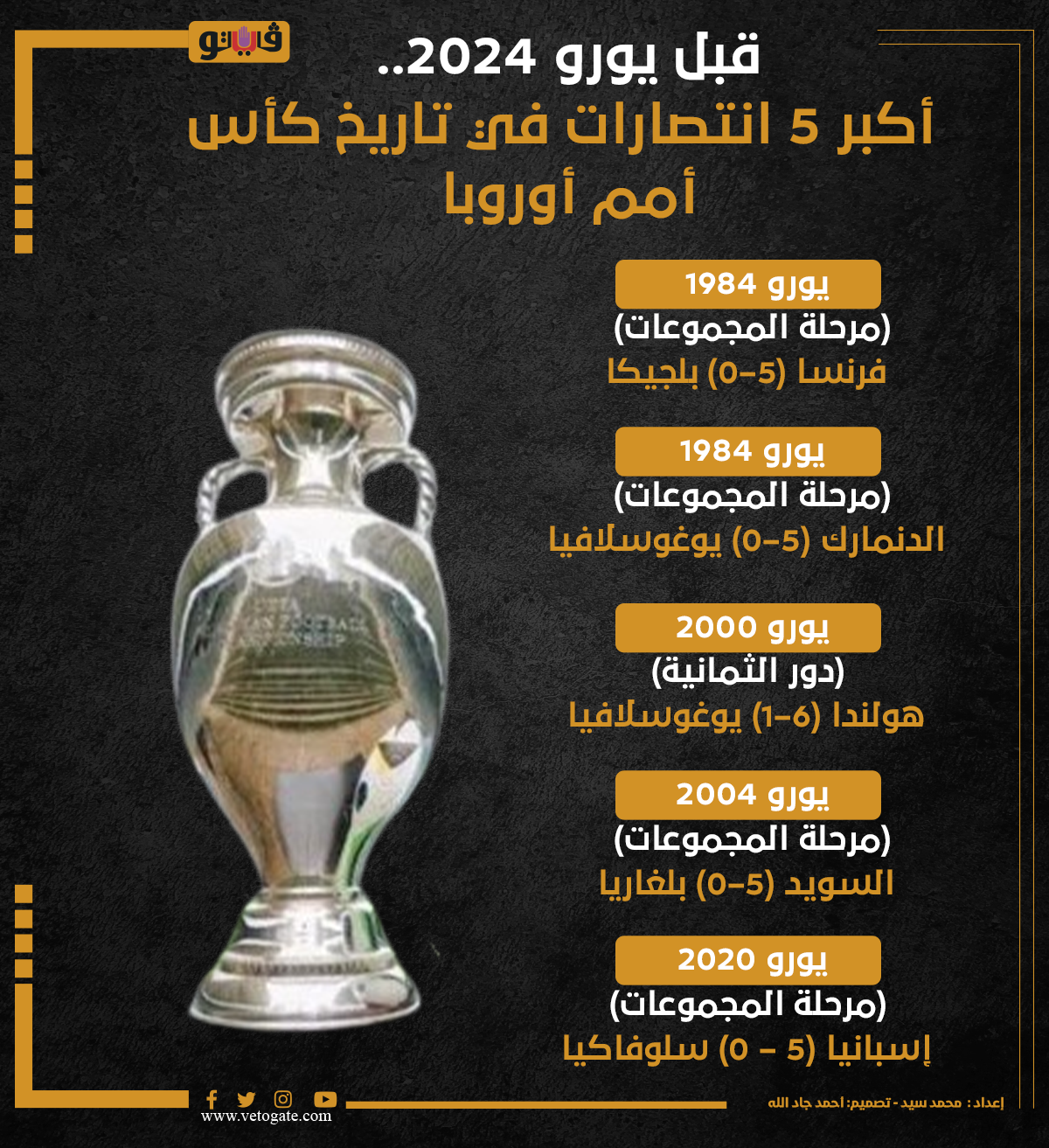 قبل يورو 2024.. أكبر 5 انتصارات في تاريخ كأس أمم أوروبا (إنفوجراف) الثلاثاء 11/يونيو/2024 - 12:02 م 6/11/2024 12:02:48 PM يورو 2024، فيتو محمد سيد شارك طباعة 18 حجم الخط شارك طباعة يورو 2024 كاس امم اوروبا يورو اسبانيا فرنسا يوغوسلافيا