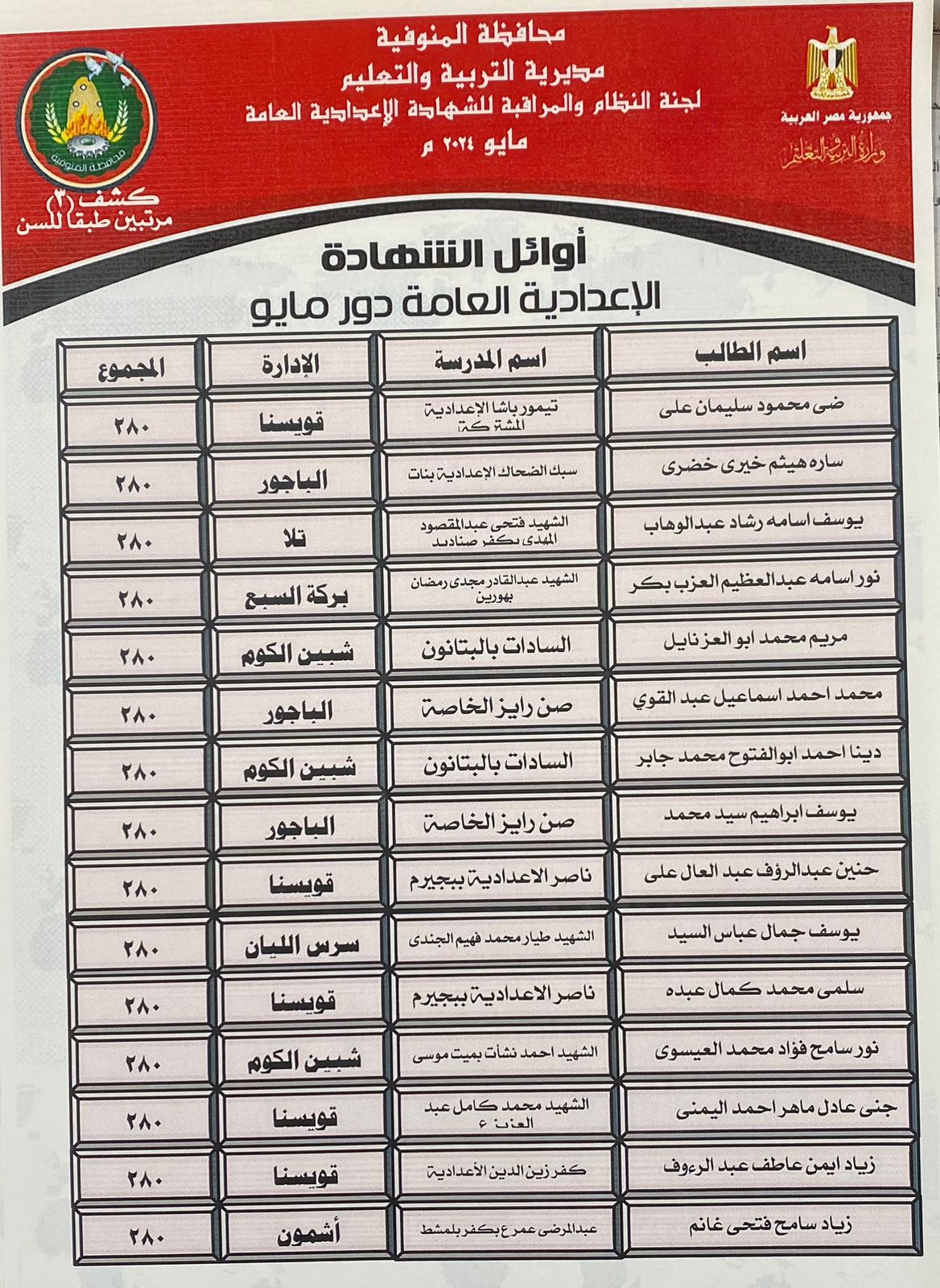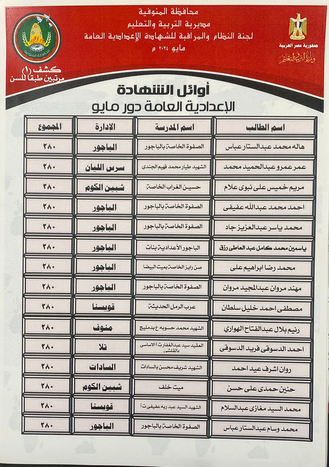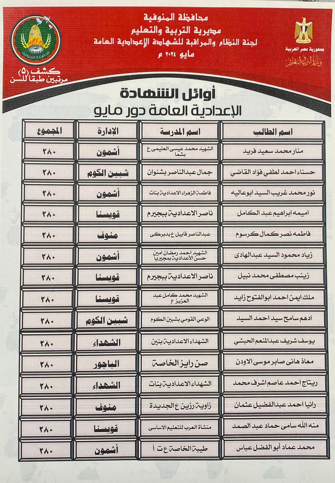 92 طالبا يحصدون الدرجات النهائية بالشهادة الإعدادية في المنوفية