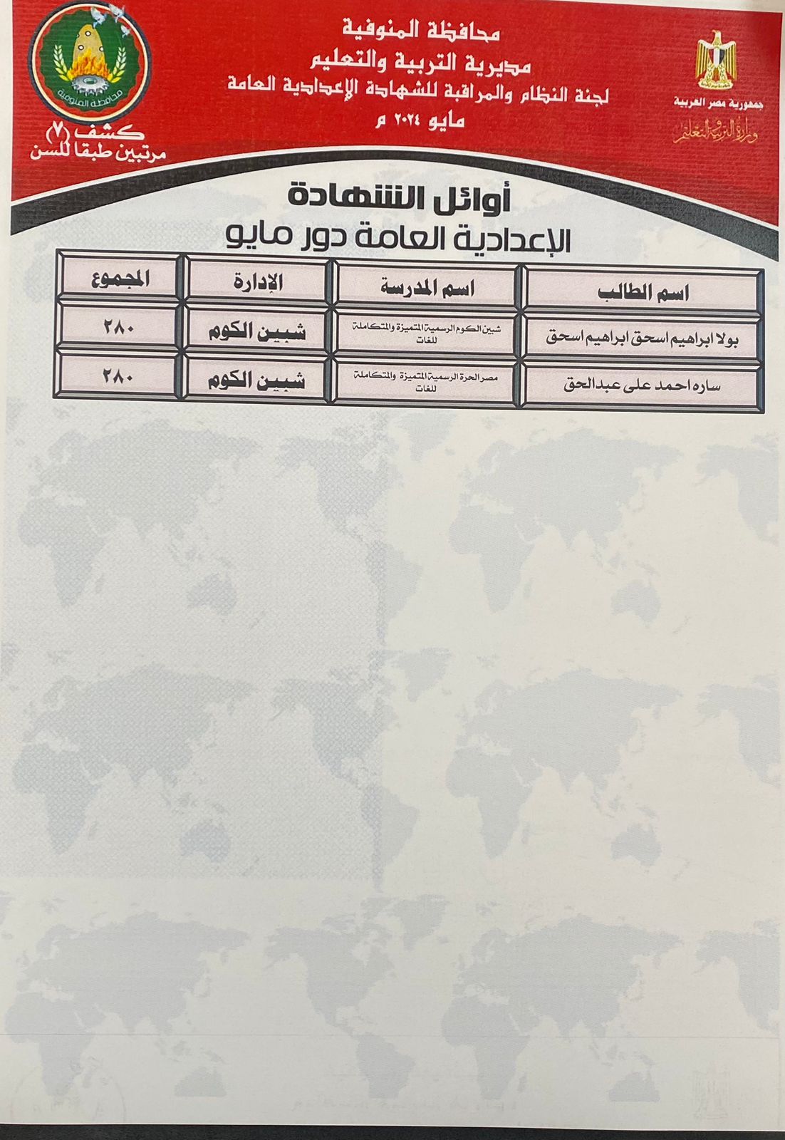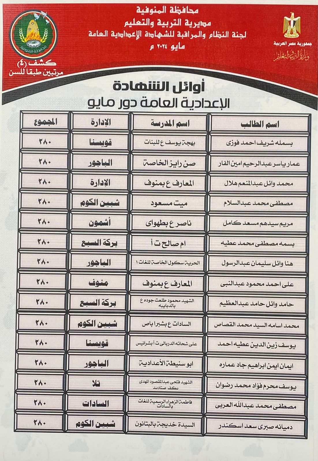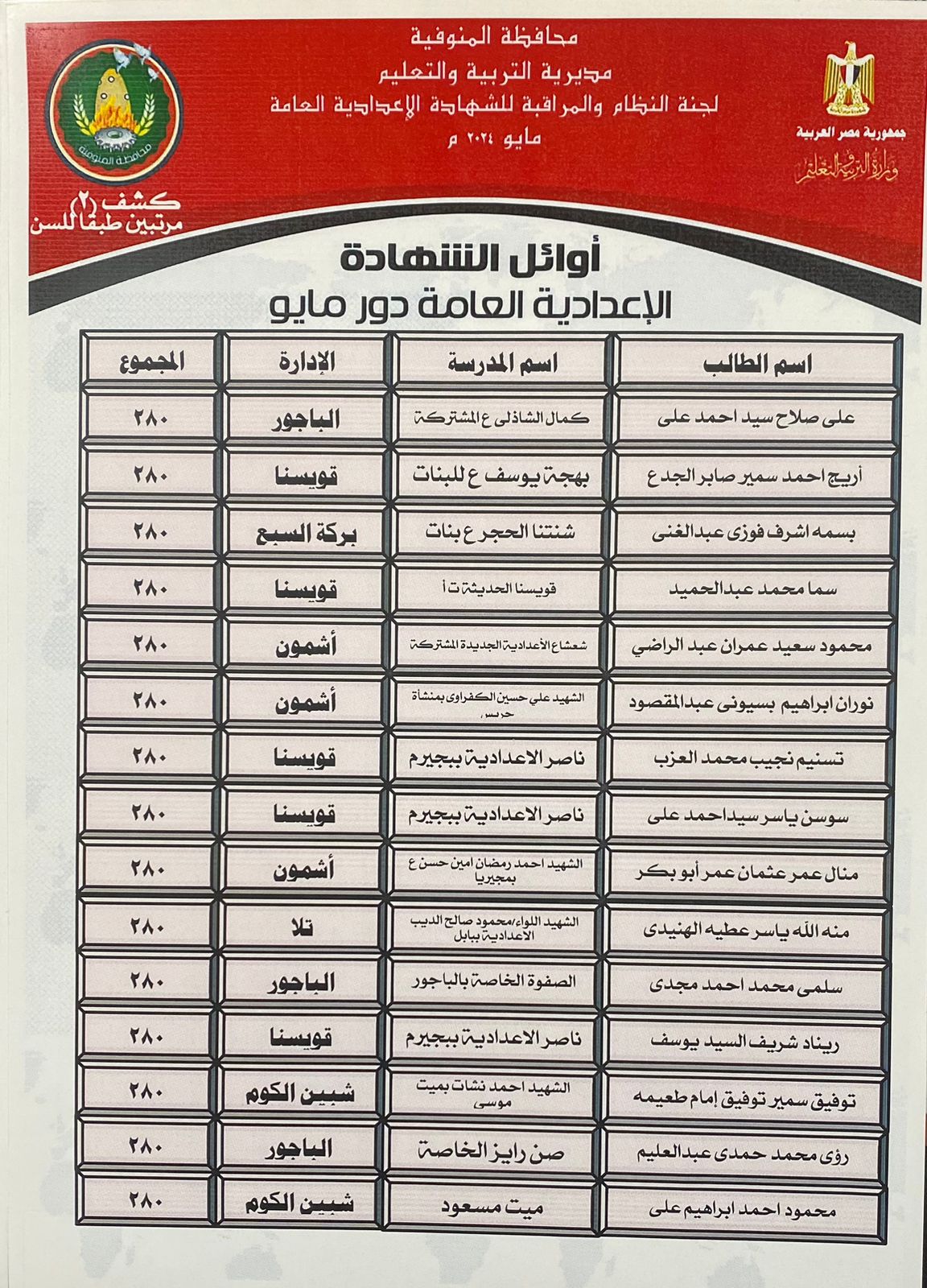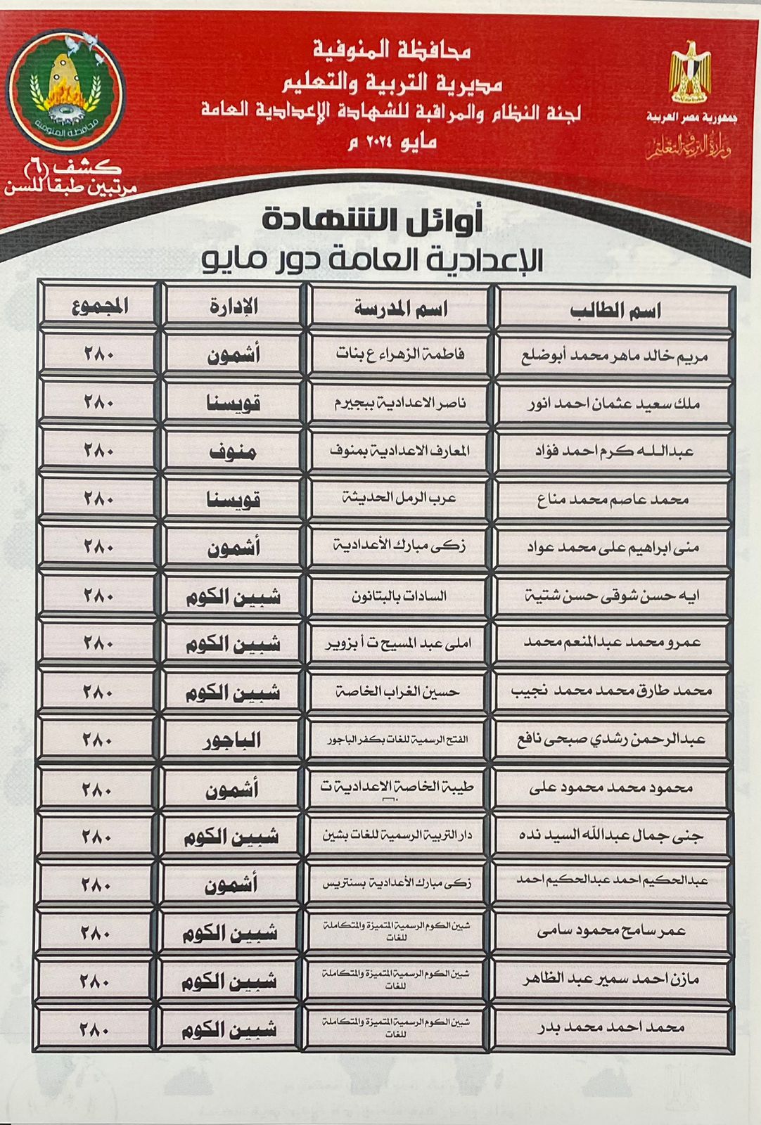 92 طالبا يحصدون الدرجات النهائية بالشهادة الإعدادية في المنوفية