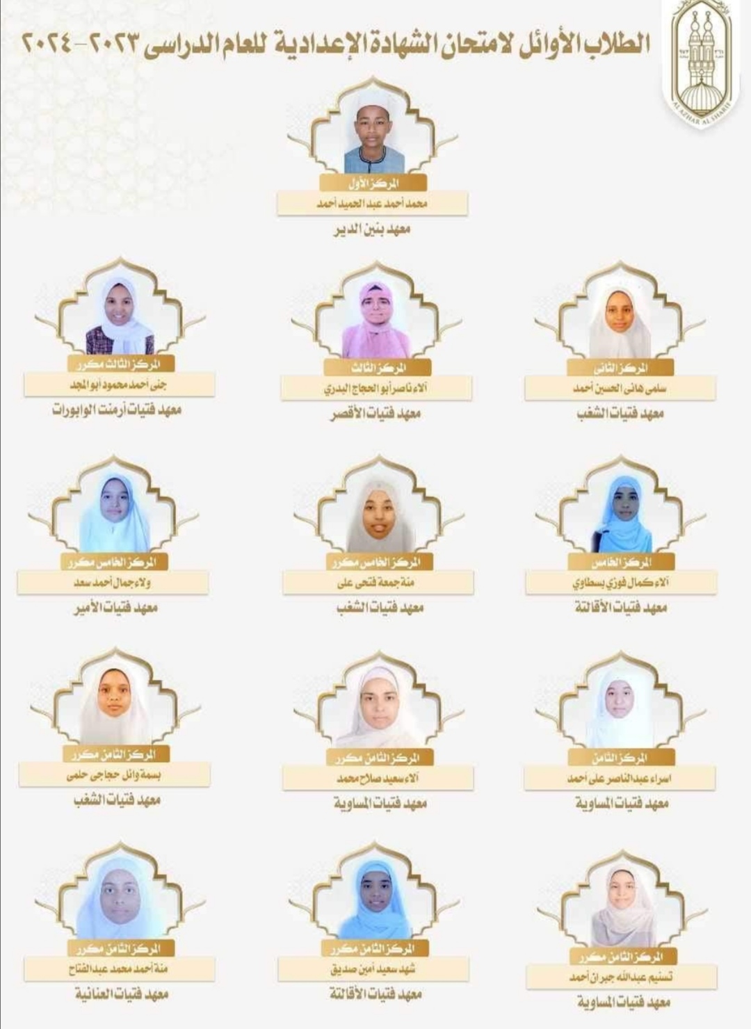 وتقدم الدكتور خليفة محمد إبراهيم رئيس الإدارة المركزية لمنطقة الأقصر الأزهرية، وأحمد عبادى مدير عام المواد الثقافية ورعاية الطلاب، والشيخ عبد الله صالح أحمد رضوان، الوكيل الشرعى والعربى، بالتهانى لأوائل الشهادة الإعدادية الأزهرية بمنطقة الأقصر الأزهرية ولجميع الناجحين من الطلبة والطالبات للعام الدراسى ٢٠٢٤/٢٠٢٣.