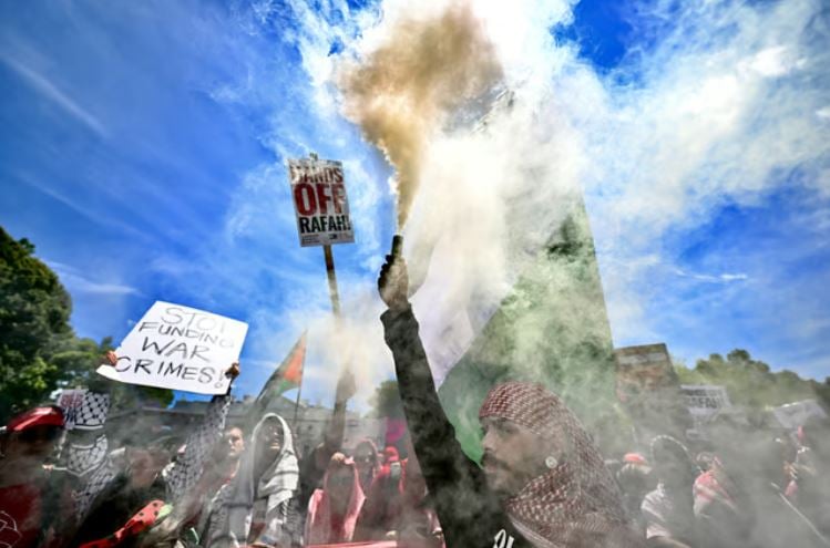 مخيم النصيرات، طالب آلاف المتظاهرين من أمام البيت الأبيض في العاصمة الأمريكية واشنطن، إدارة الرئيس جو بايدن بـ"الالتزام بخطها الأحمر بشأن غزة"، مرددين شعارات مثل: "خط بايدن الأحمر كذبة"، و"الحرية لفلسطين" و"بايدن كف عن الكذب".
