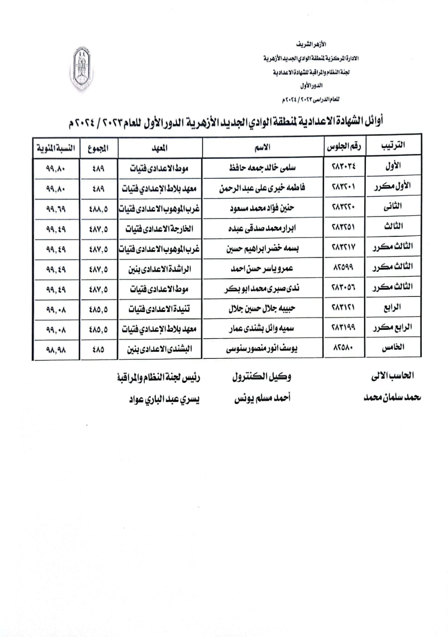 ننشر أسماء أوائل الشهادة الإعدادية الأزهرية في الوادي الجديد