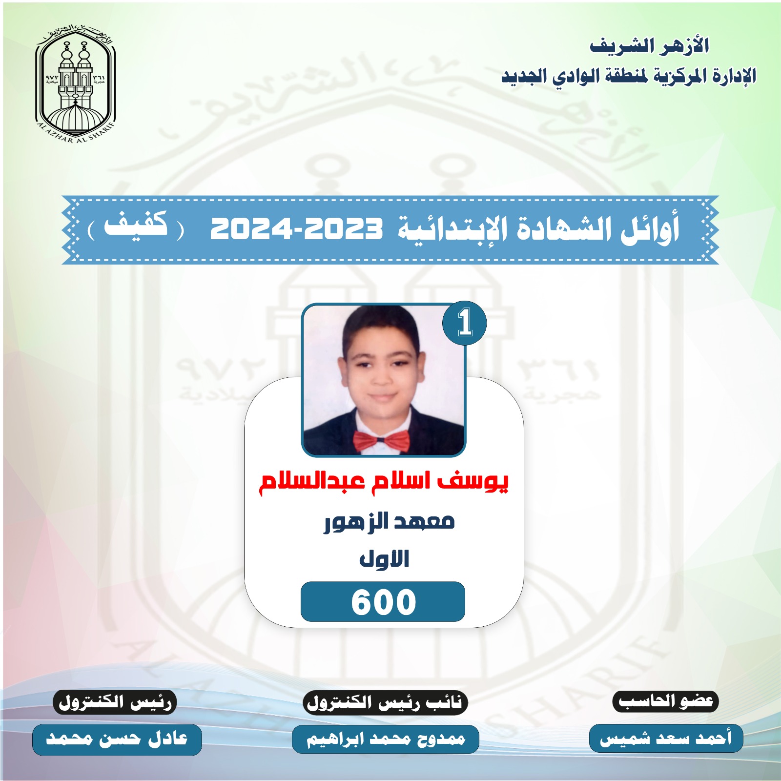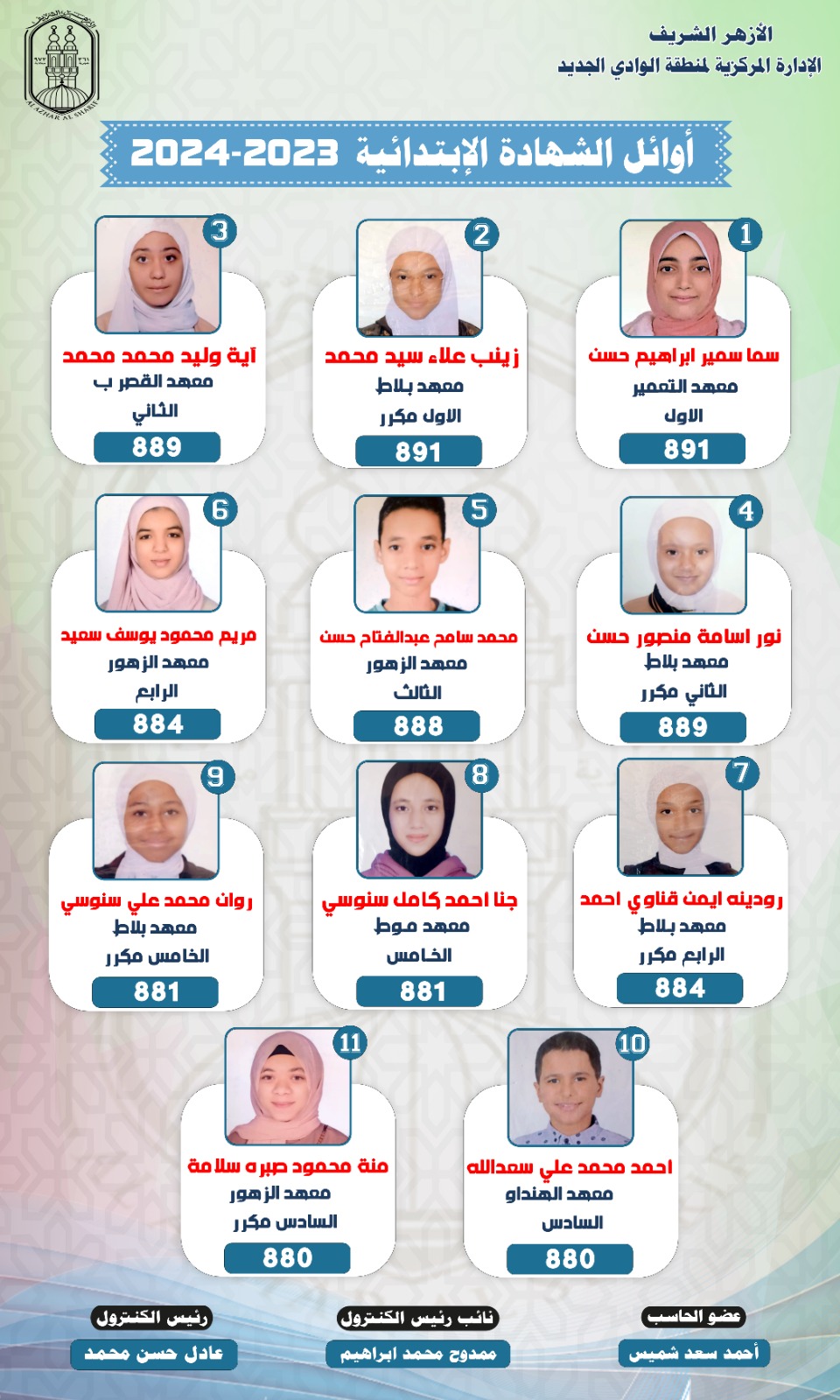 وأعلنت الإدارة المركزية لمنطقة الوادي الجديد الأزهرية، أوائل الشهادتين الابتدائية والإعدادية الأزهرية، عن العام الدراسي 2023- 2024م، وذلك عقب اعتمادها من وكيل الأزهر الشريف، وإعلانها عبر موقع بوابة الأزهر الإلكترونية.