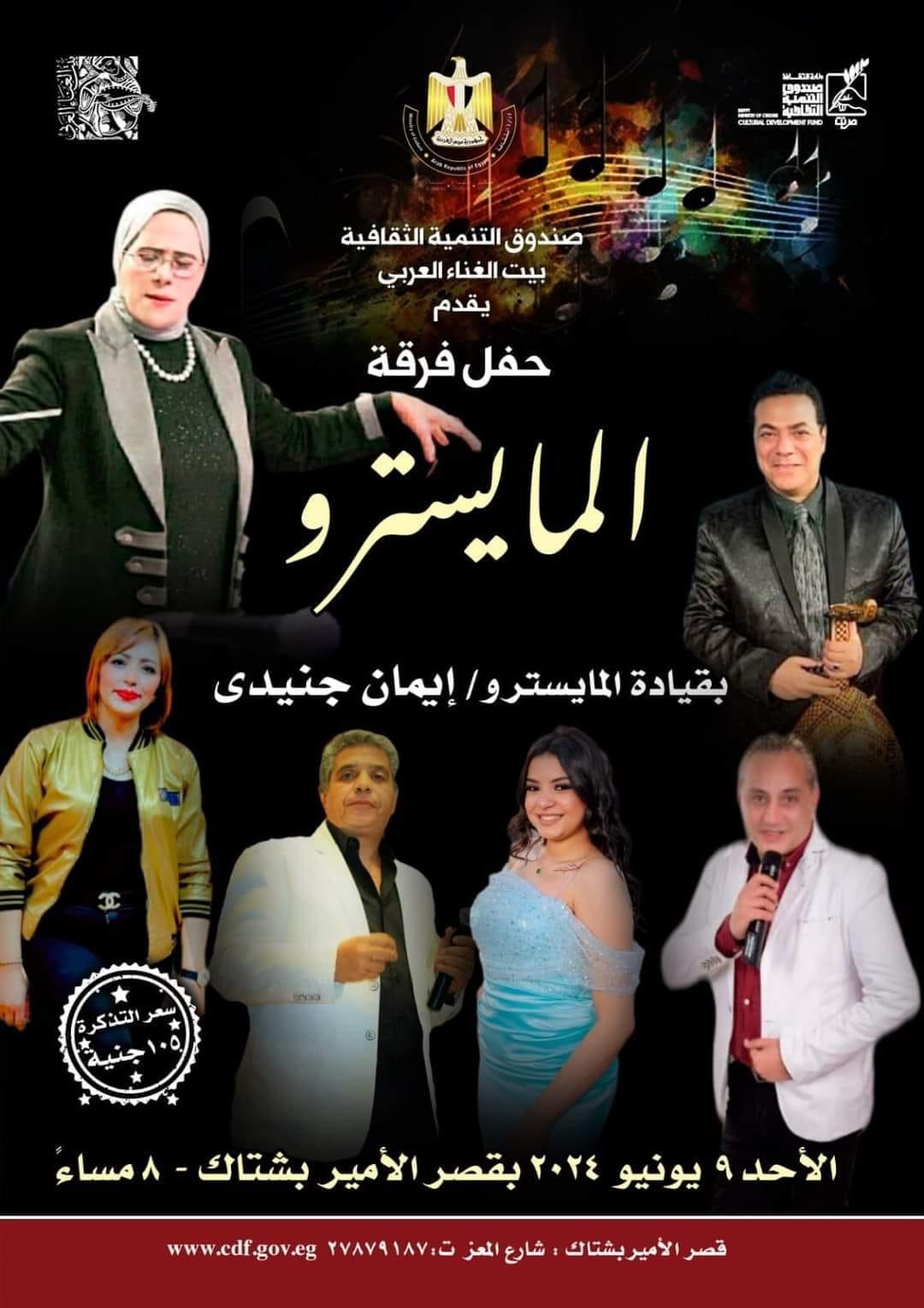 يقيم بيت الغناء العربي بقصر الأمير بشتاك، والتابع لقطاع صندوق التنمية الثقافية برئاسة الدكتور وليد قانوش حفلًا غنائيًا جديدًا لفرقة المايسترو، وذلك في تمام الثامنة من مساء اليوم الأحد ٩ يونيو الجاري.