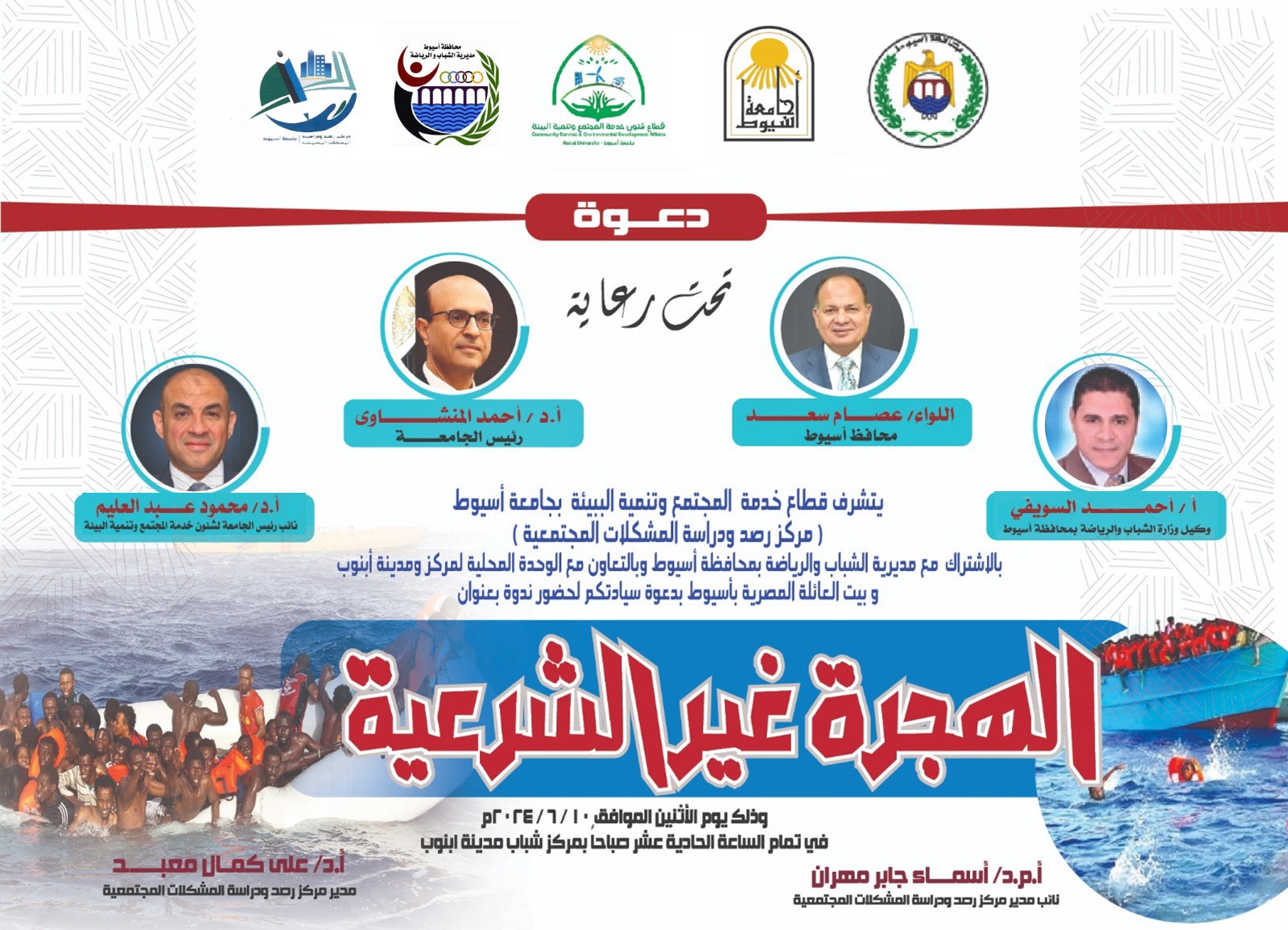 ينظم مركز رصد ودراسة المشكلات المجتمعية بجامعة أسيوط، ندوة بعنوان "الهجرة غير الشرعية: الأضرار الناجمة عنها وأساليب مكافحتها"،، تحت رعاية الدكتور أحمد المنشاوي رئيس جامعة أسيوط، وإشراف الدكتور محمود عبد العليم نائب رئيس الجامعة لشئون خدمة المجتمع وتنمية البيئة، وذلك غدا الإثنين الموافق ١٠ من يونيو، فى تمام الساعة الحادية عشر، بقاعة مركز شباب مدينة أبنوب التابعة لمديرية الشباب والرياضة.