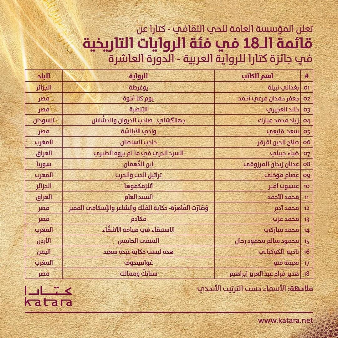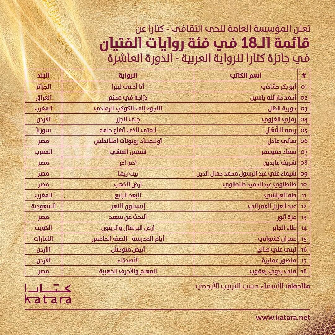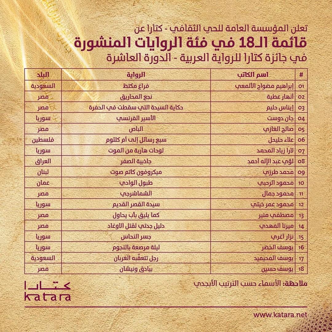أعلنت جائزة كتارا للرواية العربية، منذ قليل عن قائمة الـ 18 لأفضل الأعمال المشاركة في الدورة العاشرة، في فئات “الروايات المنشورة والروايات غير المنشورة، وروايات الفتيان، والرواية التاريخية، والدراسات النقدية”.
