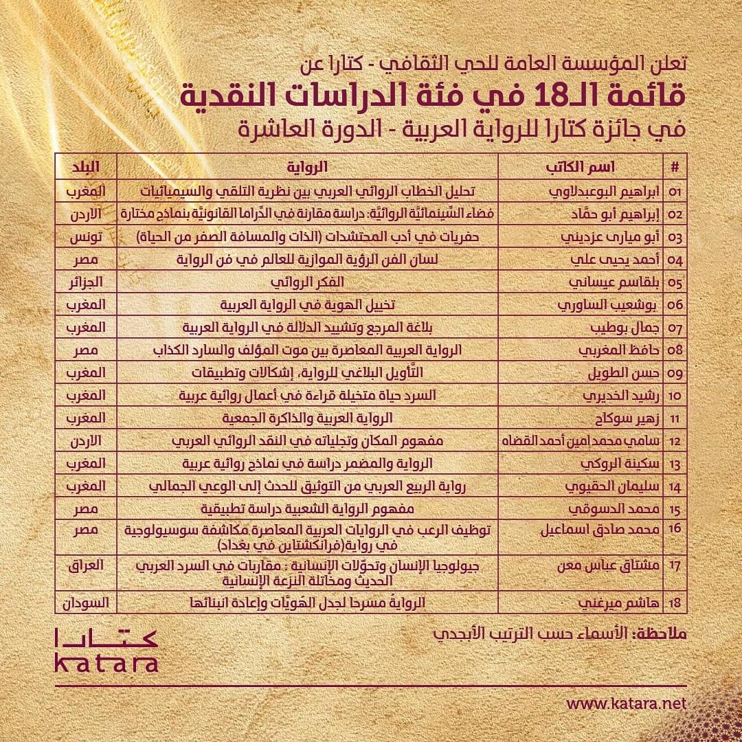 وتضم القائمة روائيين من 17 دولة عربية، منها مصر بـ 26 رواية ودراسة نقدية، تلتها المغرب بـ19 رواية ودراسة نقدية، ثم سوريا بـ 9 روايات والأردن بـ8 روايات ودراسات نقدية.