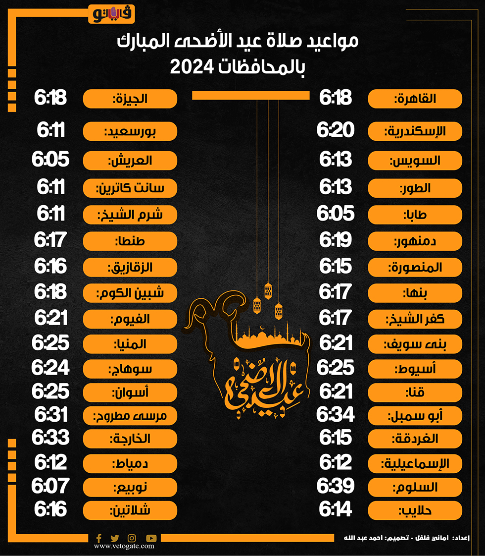 مواعيد صلاة عيد الأضحى المبارك بالمحافظات 2024 (إنفوجراف) الأحد 09/يونيو/2024 - 09:04 م 6/9/2024 9:04:14 PM مواعيد صلاة عيد الأضحى المبارك بالمحافظات أماني فلفل شارك طباعة 18 حجم الخط شارك طباعة