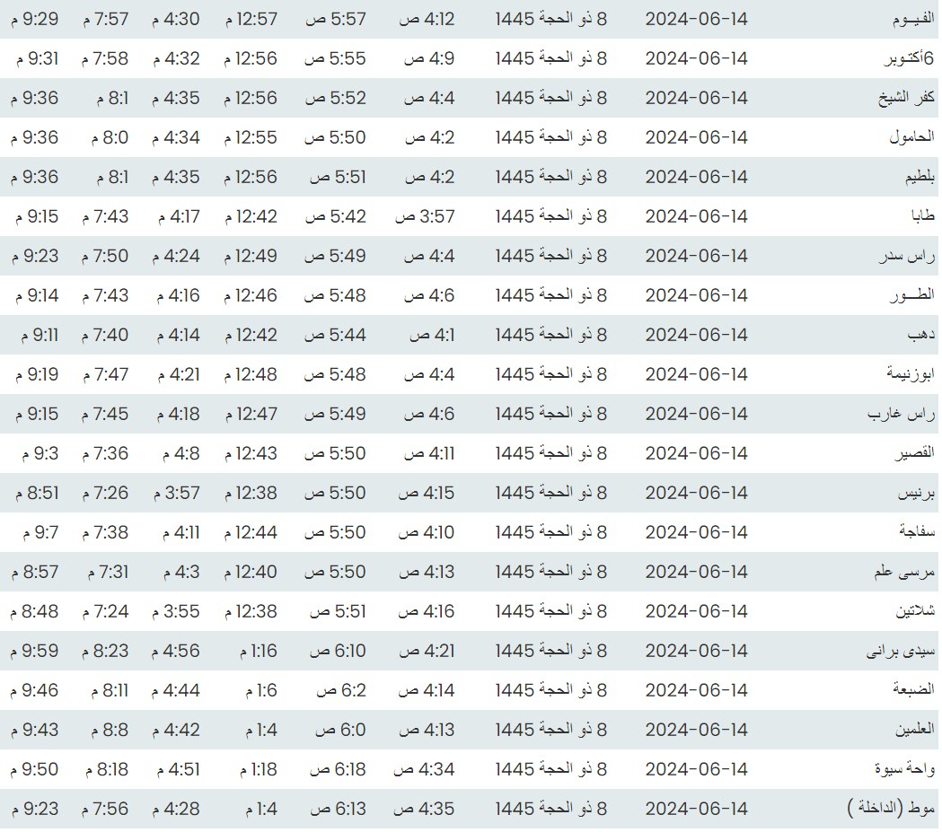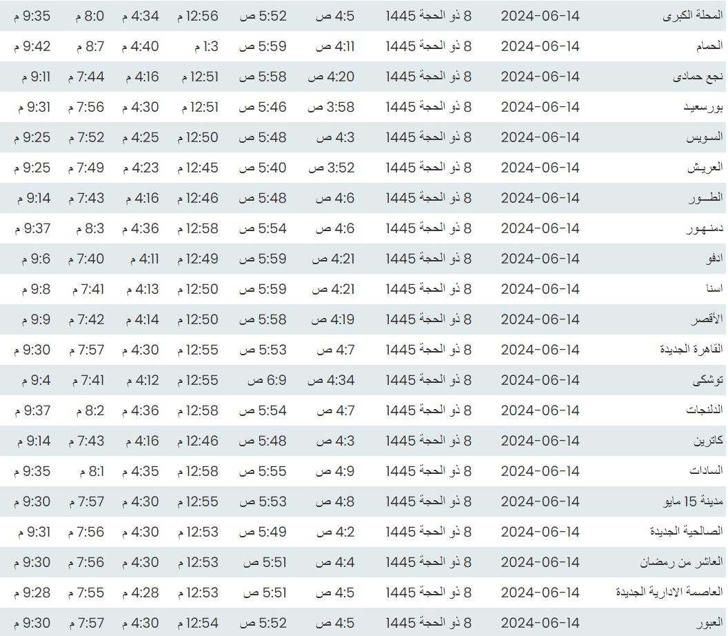 مواقيت الصلاة اليوم وفقًا للتوقيت المحلي لمدينتي القاهرة والإسكندرية وكذلك،مواقيت الصلاة، لعدد من مدن ومحافظات الجمهورية من واقع بيانات الهيئة العامة للمساحة