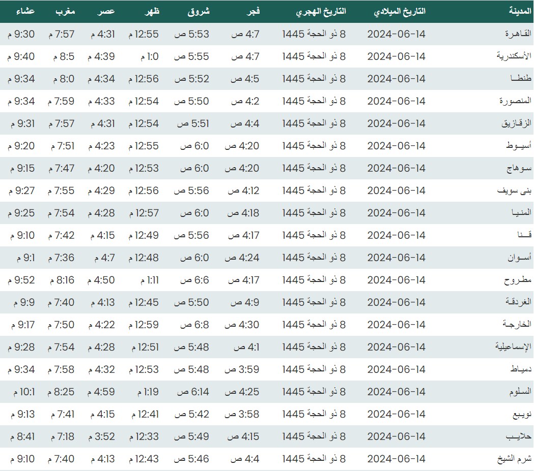 وفيما يلي مواقيت الصلاة، لعدد من مدن ومحافظات الجمهورية من واقع بيانات الهيئة العامة للمساحة