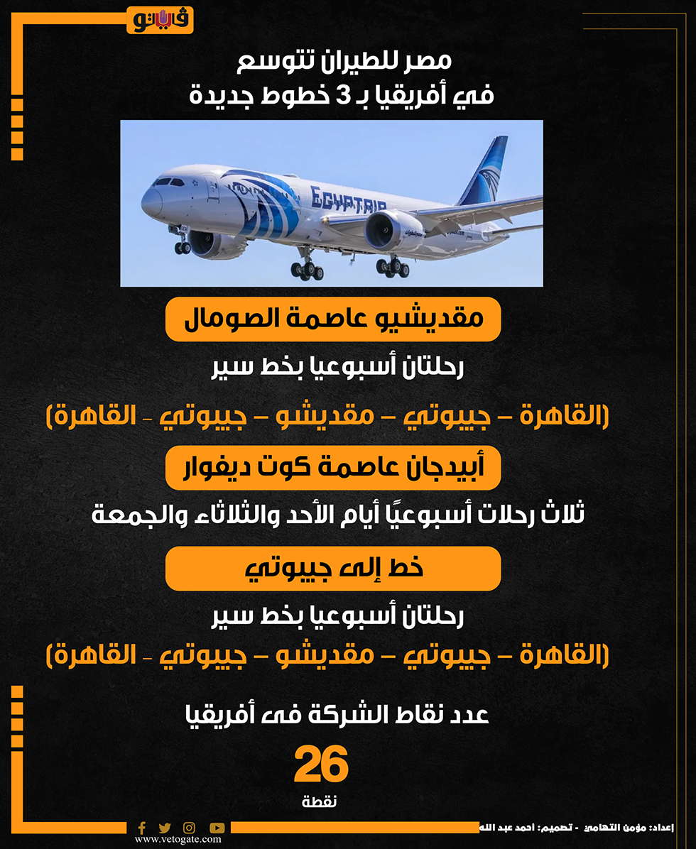 مصر للطيران تتوسع في أفريقيا بـ3 خطوط جديدة (إنفوجراف) الإثنين 10/يونيو/2024 - 06:30 م 6/10/2024 6:30:27 PM مصر للطيران،فيتو - مؤمن التهامي شارك طباعة 18 حجم الخط شارك طباعة مصر للطيران كوت ديفوار خطوط جديدة لمصر للطيران أبيدجان عاصمة كوت ديفوار الصومال