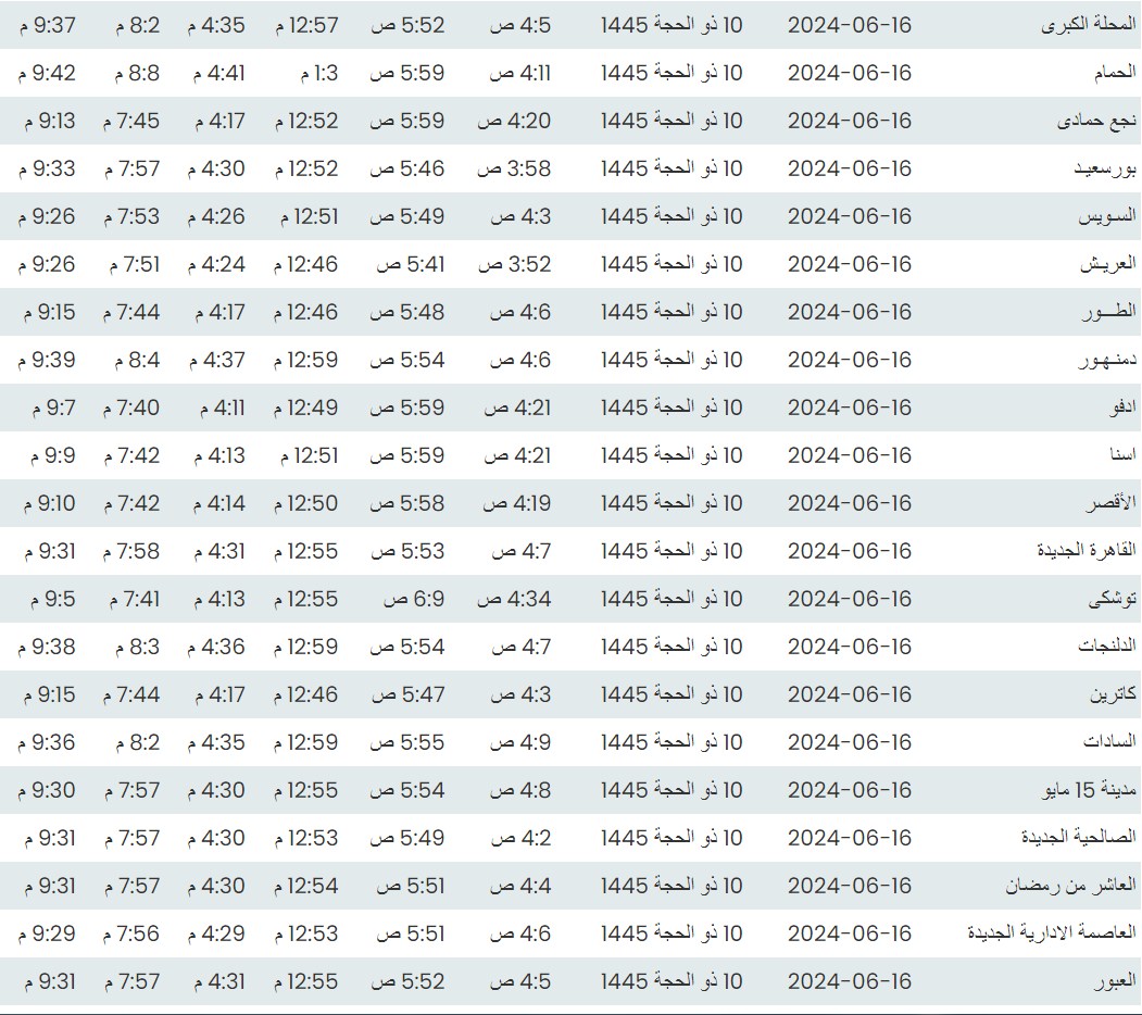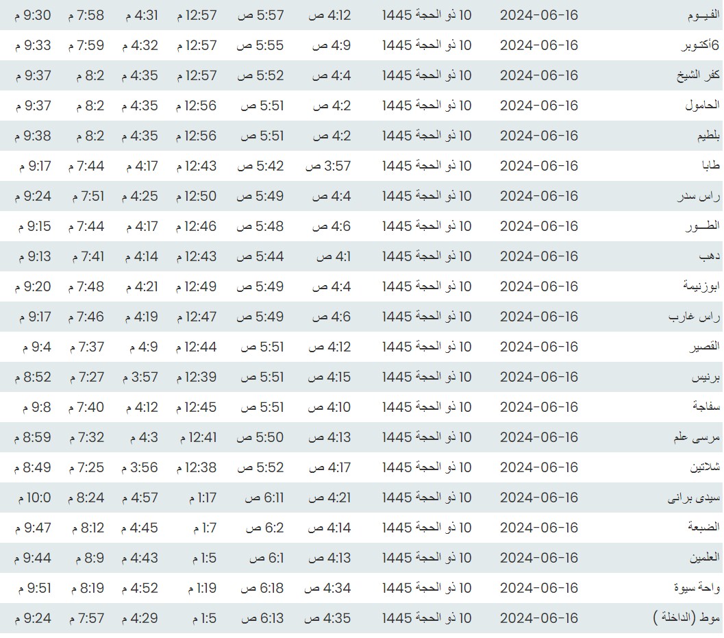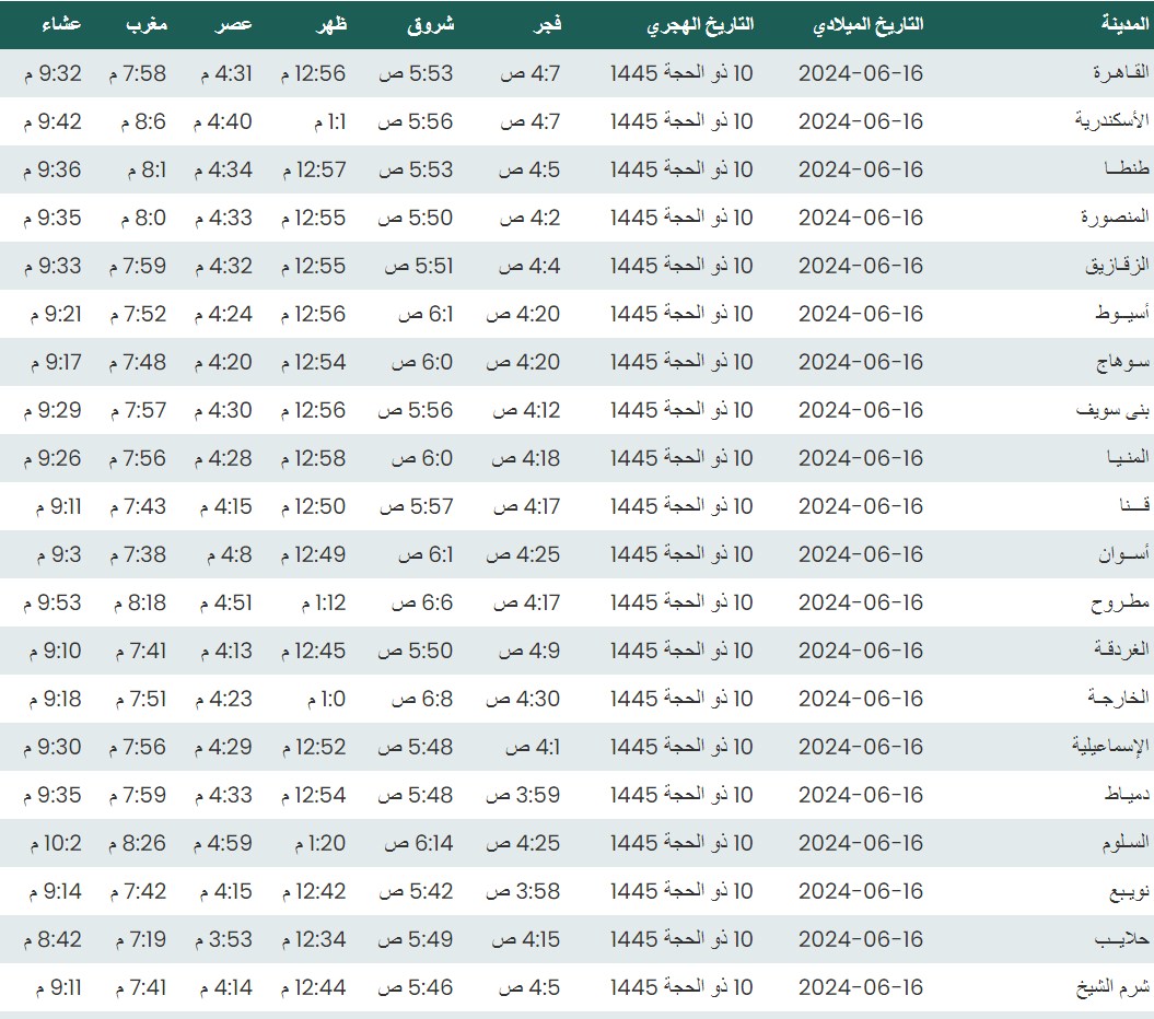وفيما يلي مواقيت الصلاة، لعدد من مدن ومحافظات الجمهورية من واقع بيانات الهيئة العامة للمساحة