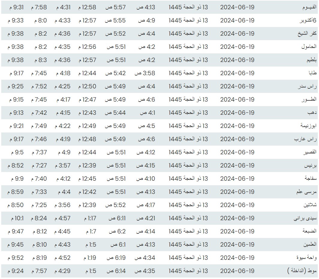مواقيت الصلاة اليوم وفقًا للتوقيت المحلي لمدينتي القاهرة والإسكندرية وكذلك، مواقيت الصلاة، لعدد من مدن ومحافظات الجمهورية من واقع بيانات الهيئة العامة للمساحة