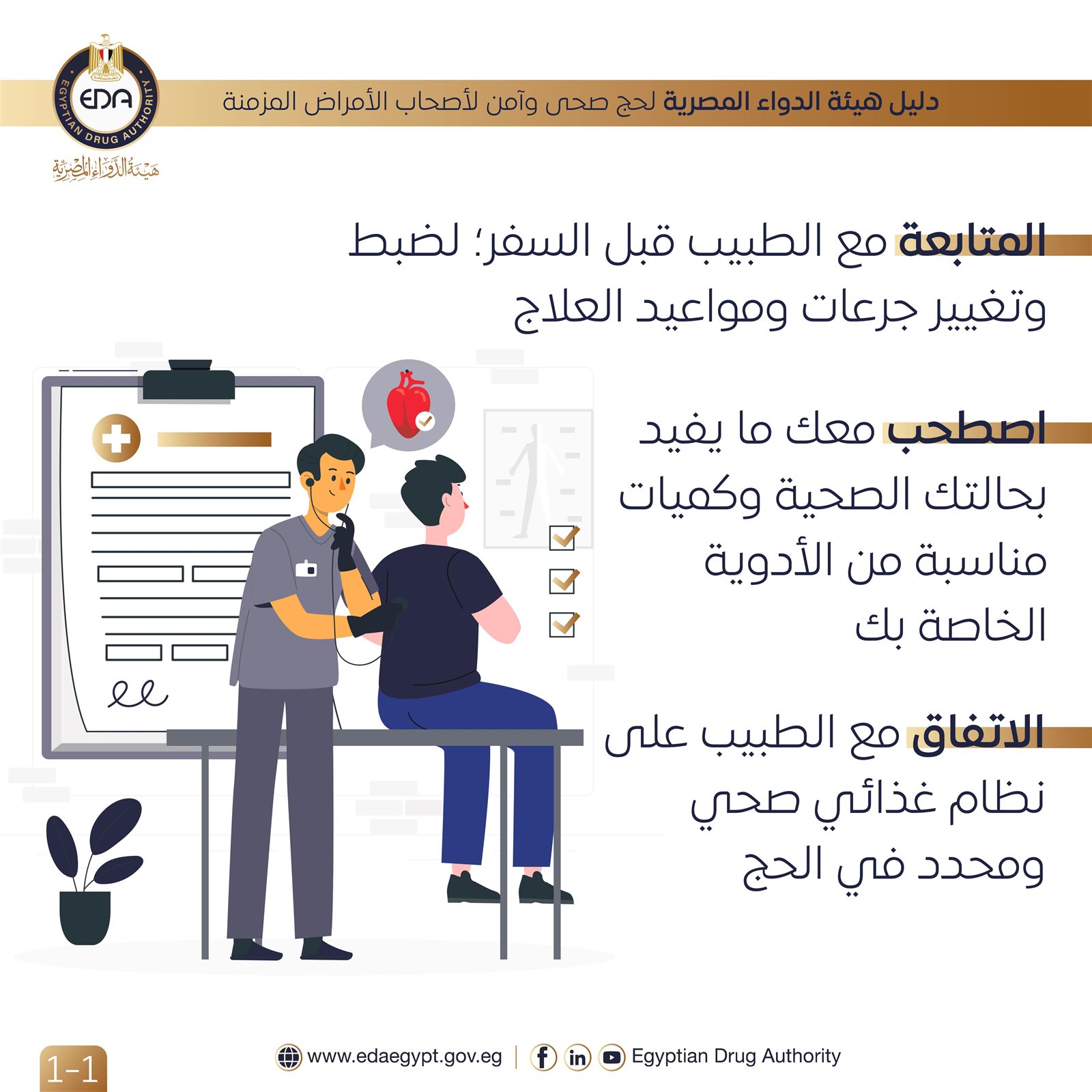 ونصحت هيئة الدواء المصرية الحجاج بضرورة المتابعة مع الطبيب لضبط جرعات العلاج والاتفاق معه على نظام غذائي صحي في الحج.