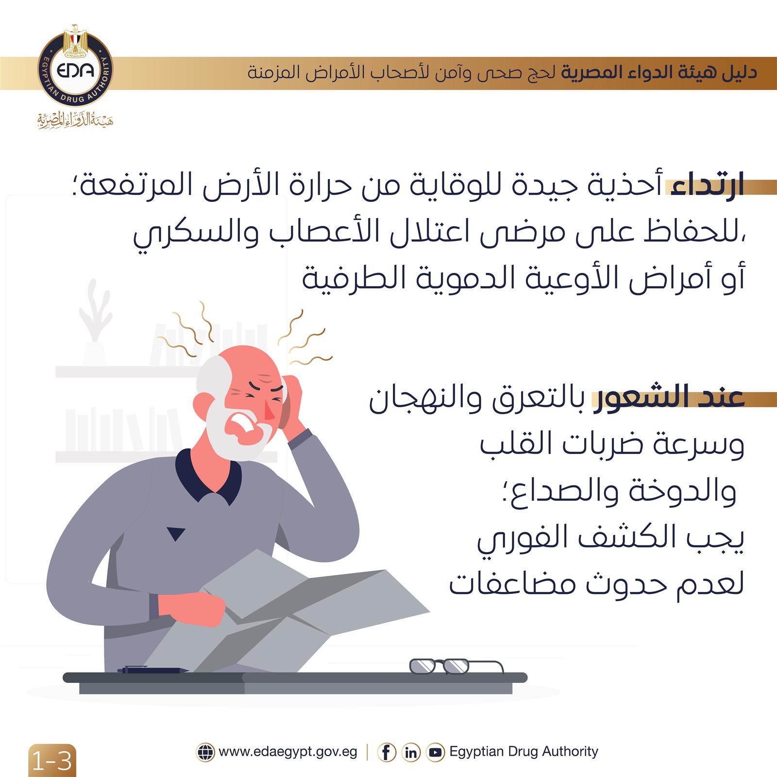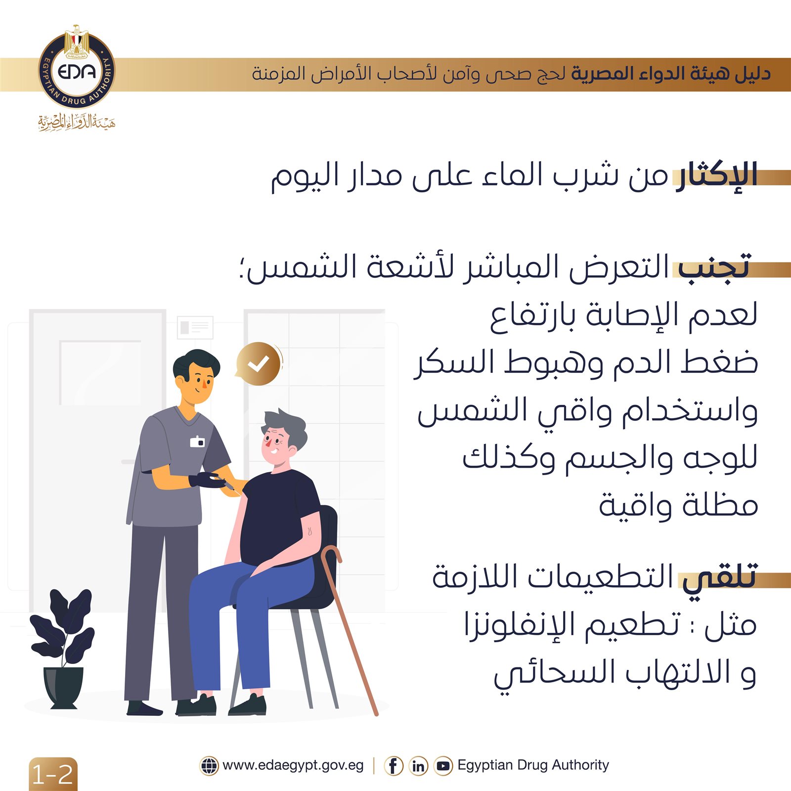 كما وجهت هيئة الدواء المصرية بتناول التطعيمات مثل الانفلونزا والالتهاب السحائي، كما نصحت بارتداء أحذية جيدة للوقاية من حرارة الأرض المرتفعة للحفاظ على مرضى الاعتلال السكري والتهاب الأعصاب.