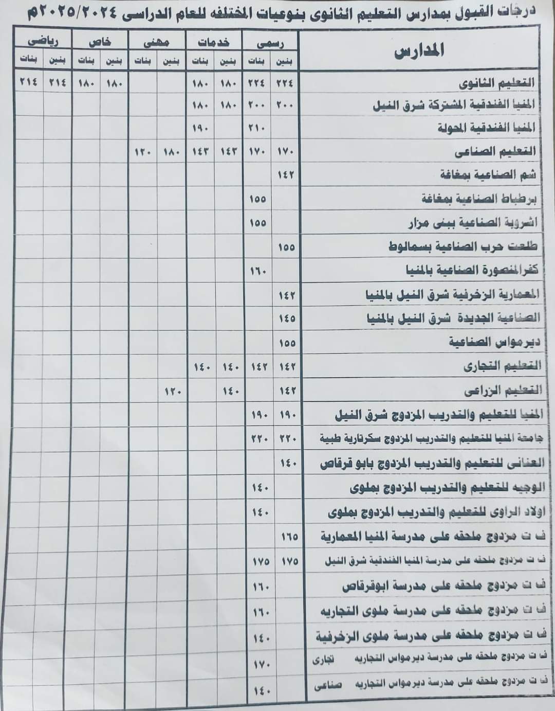 تنسيق قبول الصف الأول الثانوي العام بمجموع 224 درجة في المنيا