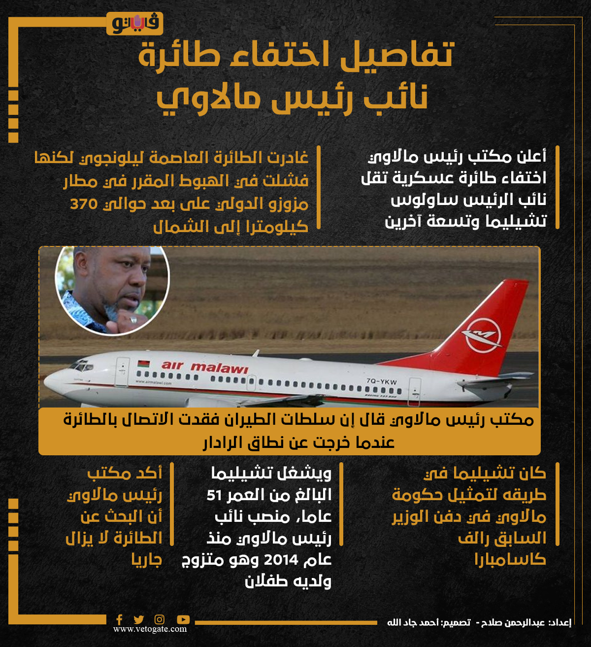 تفاصيل اختفاء طائرة نائب رئيس مالاوي (إنفوجراف) الثلاثاء 11/يونيو/2024 - 12:24 م 6/11/2024 12:24:05 PM اختفاء طائرة نائب رئيس مالاوي، فيتو عبدالرحمن صلاح شارك طباعة 18 حجم الخط شارك طباعة مالاوي رئيس مالاوي العاصمة ليلونجوي مطار مزوزو نائب رئيس مالاوي اختفاء طائرة نائب رئيس مالاوي