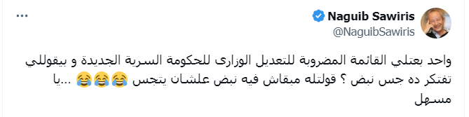 وقال نجيب ساويرس عن القائمة المزعومة للتشكيل الوزاري الجديد: "واحد بعتلي القائمة المضروبة للتعديل الوزاري للحكومة السرية الجديدة وبيقولي تفتكر ده جس نبض؟"