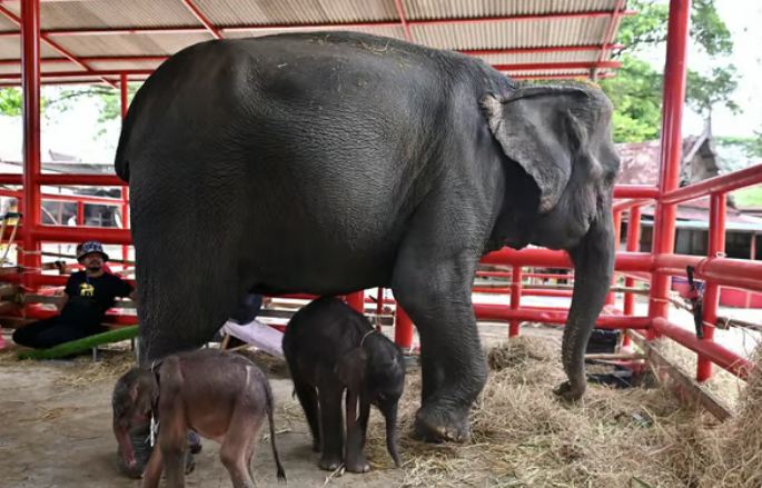 أنجبت فيلة في تايلاند توأمين، وشهدت هذه الولادة التي تُعد نادرة لدى هذه الثدييات الضخمة المهددة بالانقراض، اضطرابًا في الوضع الصحي للأم التي أصيبت بجروح أثناء الولادة.