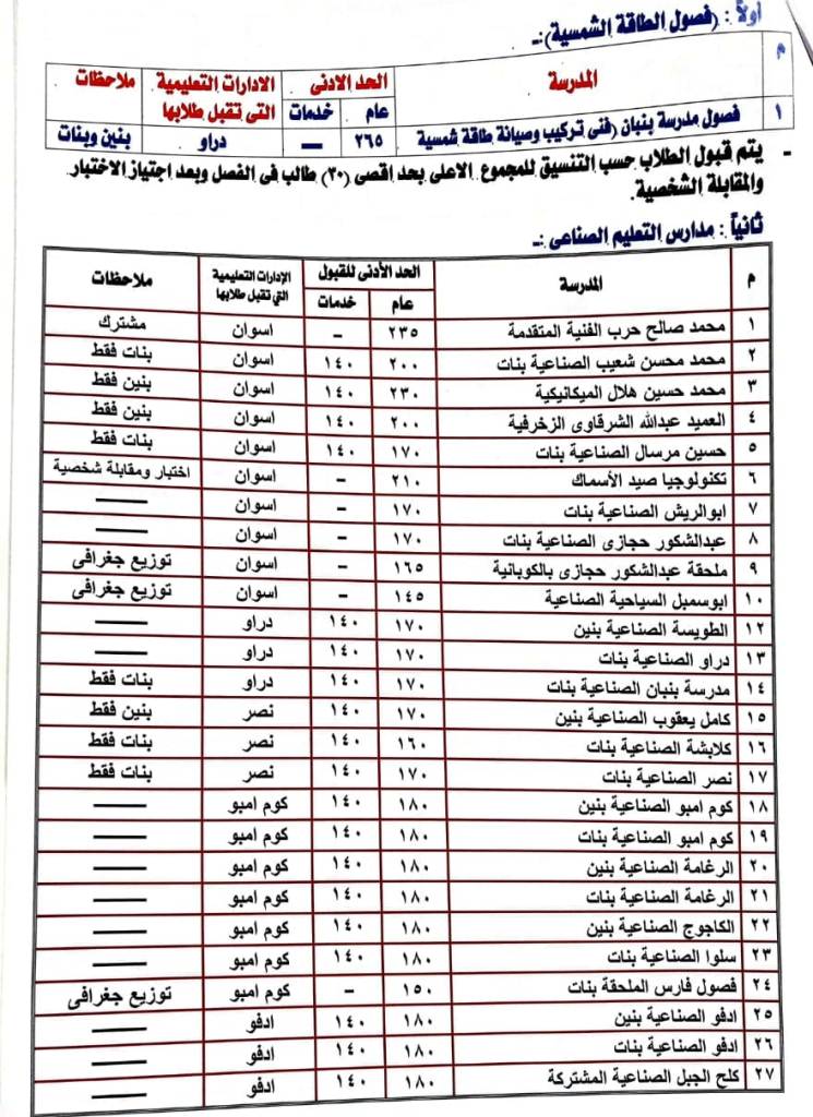 جاء ذلك أثناء عرض المهندس محمد الرشيدى مدير مديرية التربية والتعليم لقواعد التنسيق على محافظ أسوان الذى اعتمد درجات قبول الطلاب الحاصلين على شهادة إتمام مرحلة التعليم الأساسى بمدارس المرحلة الثانوية سواء للتعليم العام أو الفنى للعام الدراسى القادم 2024/2025 حيث سيكون الحد الأدنى للقبول بالثانوى العام ( خدمات ) 190 درجة، فى حين يتراوح الحد الأدنى للقبول بمدارس التعليم الفنى والمهنى والخدمات فنى ما بين 140 درجة إلى 235 درجة كمرحلة أولى حسب نوعية المدرسة ونظام الدراسة بها.